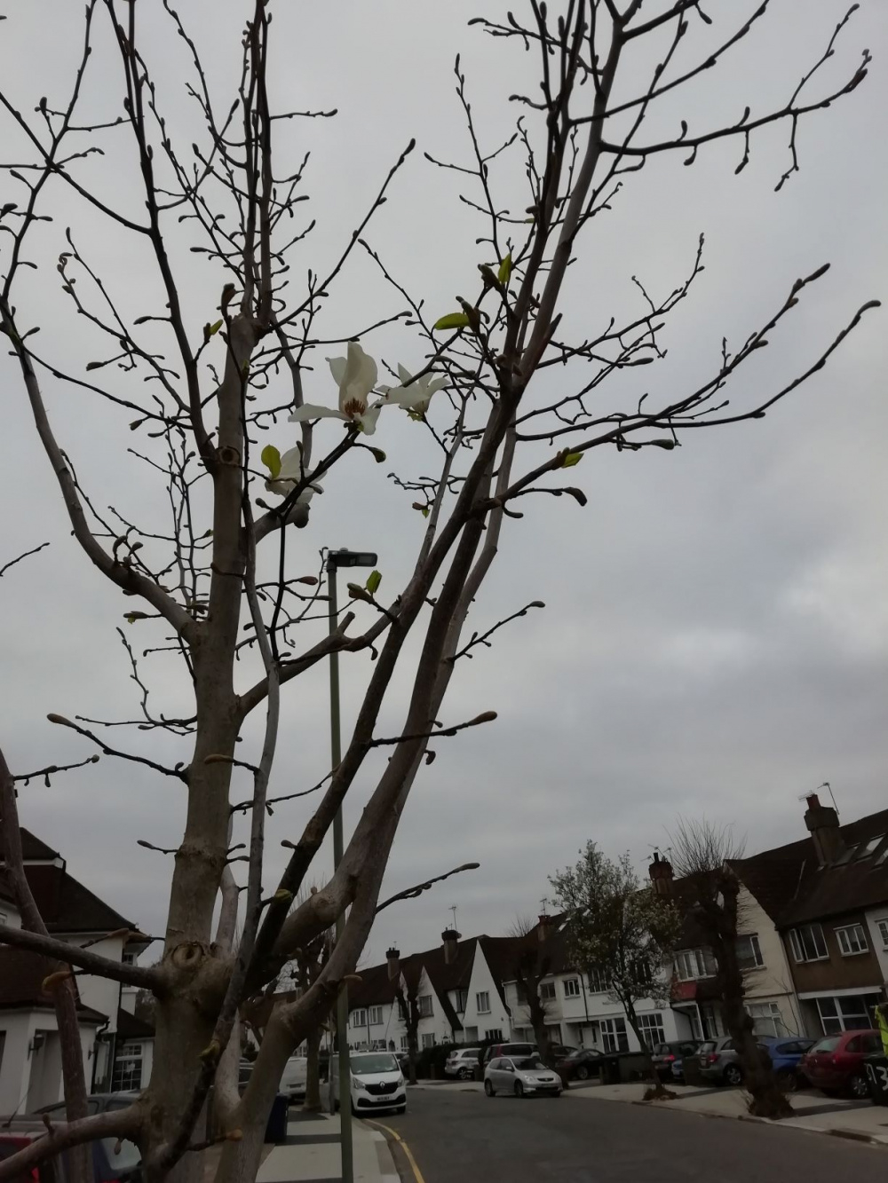 The photo is a bit dark, but it looks like a Magnolia to me. They mostly flower around now.