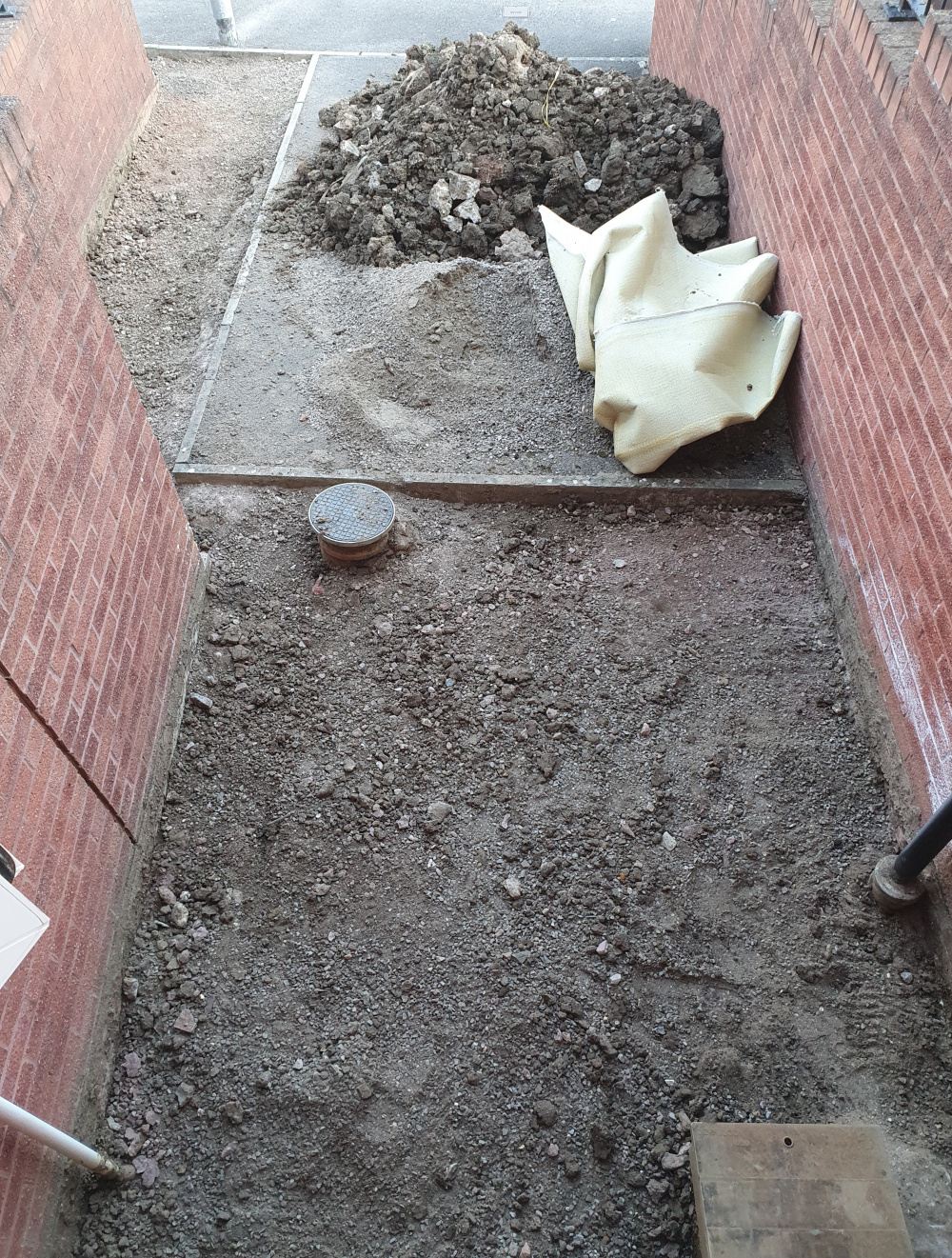 Levelled the area out ready for hard-core. Just need no bigger than 10mm right? Don't want bricks to form a base for decorative stones. It's a sound base there now. Just have to raise it 3 inches then 2 inches of decorative aggregate.