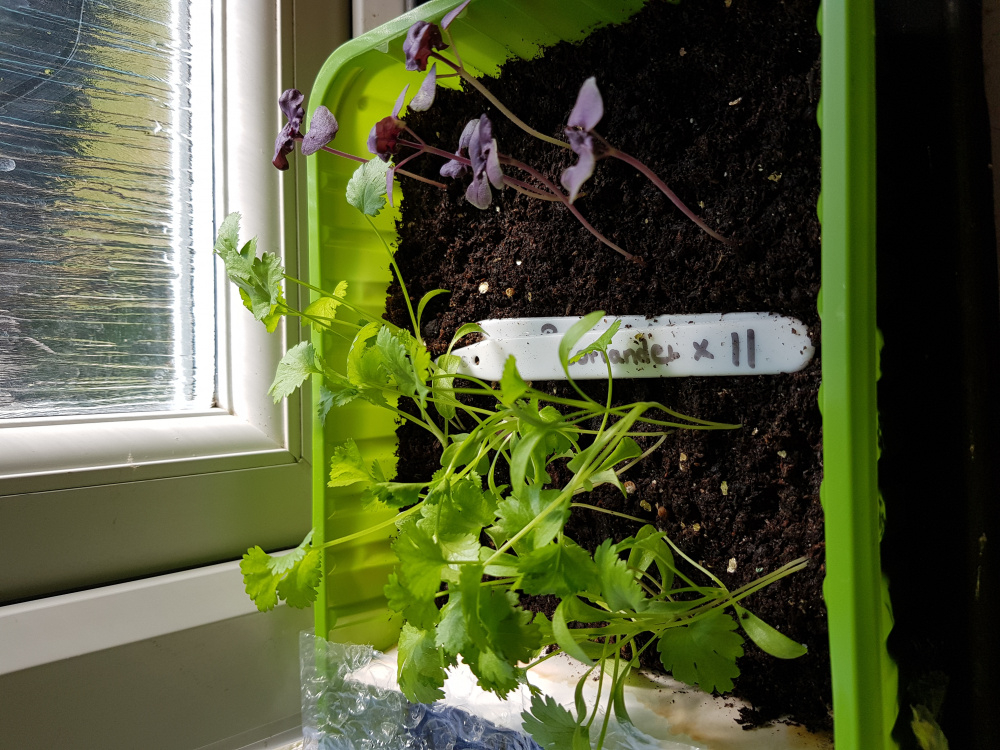 I think my coriander and basil seedlings are now ready to pot up from their current seed tray home. Question is how deep I should plant their stems? The coriander plants have about 6cm between top of soil and seed leaves, and basil around 8cm. Can both coriander and basil stems be buried up to their seed leaves? My coriander also seems to have produced two stems from each seed; do I treat each set as a single plant? I'll grow all on until I plant out end of May/June time.
