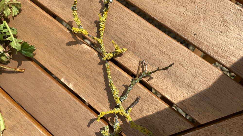 produce leaves. Cut it back a little and that seemed to help. It doesn’t seem to be blooming much at all now. It has a yellow/green coating all over it (? Lichen). Would be very grateful for any advice.