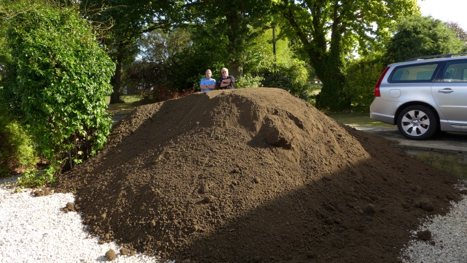 I used 25 ton of topsoil and 15,000 litres (that's how they sell it) farmyard manure/mushroom compost - good as it is, I should have used less topsoil and more manure.