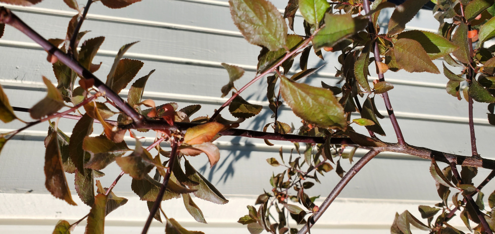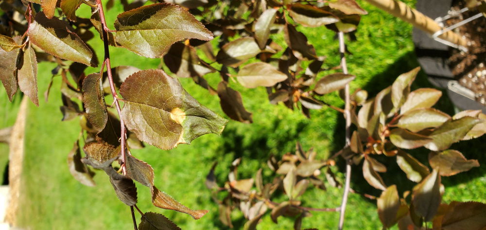 I started this plum tree from seed 3 years ago. Its parent is mostly ornamental (occasionally fruit bearing). I noticed the tips of the branches curling up and backwards, the leaves on them had turned a weird dark green (picture attached). Now i see the new, smaller leaves turning orange. No aphids—any thoughts or suggestions?