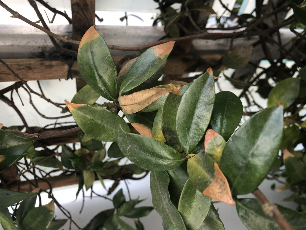 my jasmine is on my balcony, south facing, and isn’t happy. The leaves are brown as you can see from the picture. I probably water once a week, with plant feed during spring months. Do I need to water less, more, feed it something else? Cut it down?