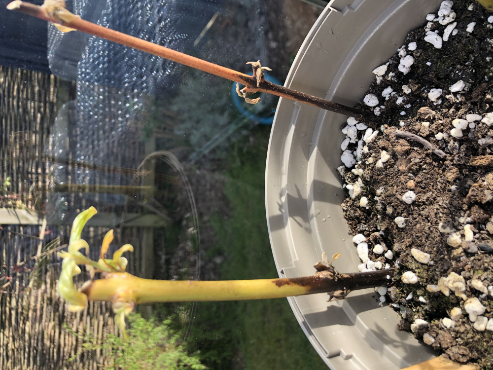 I’m hoping someone can help me understand what’s going on with the hardwood cuttings of Cornus Midwinter Fire. I took them in late January and placed them in potting compost in my unheated greenhouse. I watered from time to time to them to keep them moist. They were fine for for a good couple of months and leaves developed on all the cuttings and they looked really healthy. Then in the last month I noticed that the cuttings were slowly going black from the base upwards, eventually causing the growth the die off.