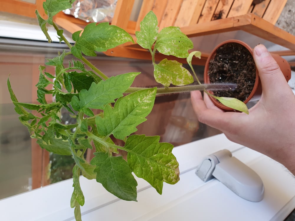 I have returned from a short holiday to find my tomatoes (in coldframe and windowsill) looking a little sad-with browny-yellow-white blotches on the leaves. They did look at little sad when I left them out accidentally overnight a week or so ago (in my defence, I am in London in a very sheltered position). Could this be a result on that or is it something else? The newer leaves look happier. Should I leave as is, take off the damaged leaves or start again? Pic below (some are worse than this, some better).