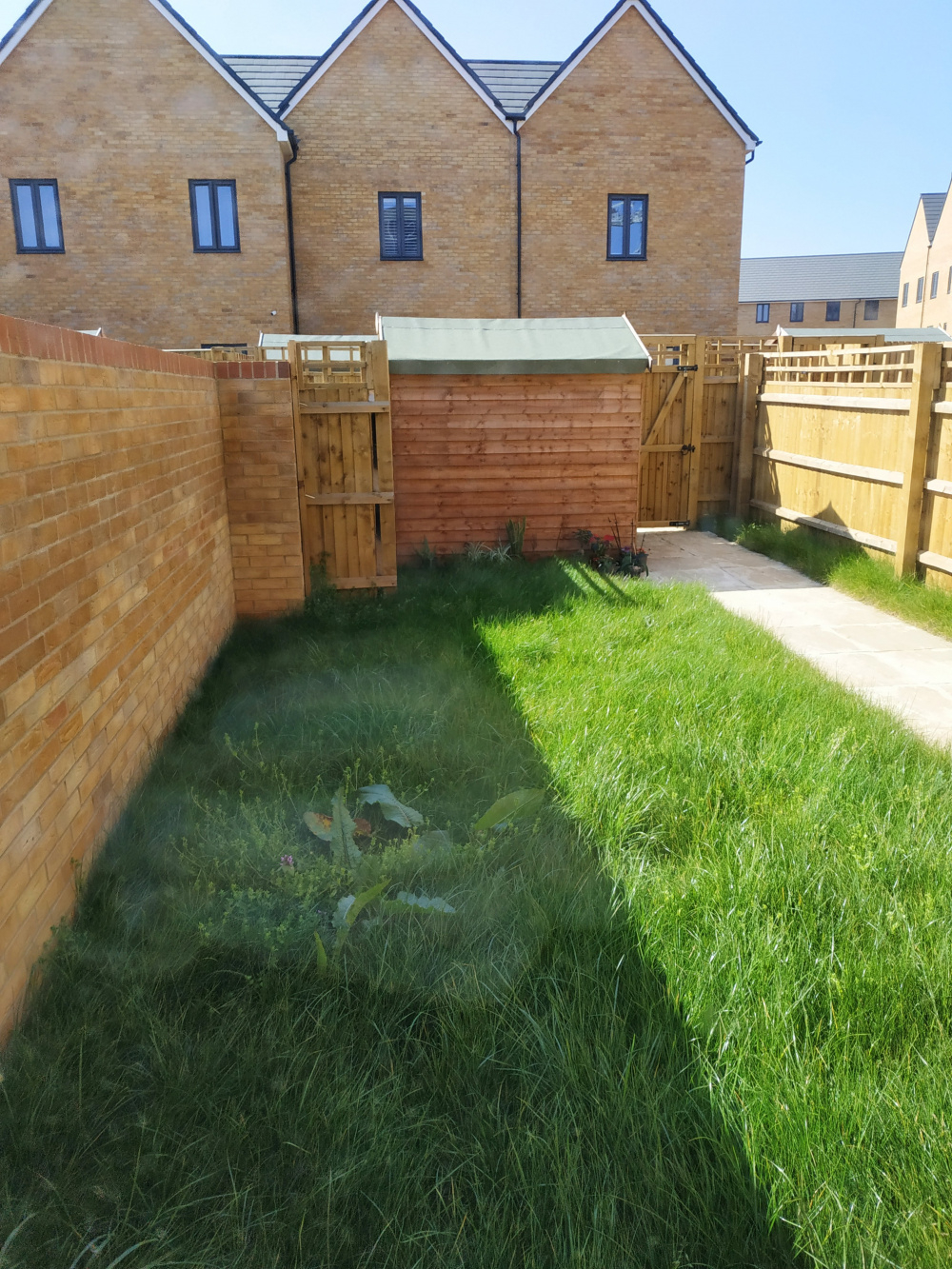 Her lawn is only about 3 metres wide and 6 metres long. Her house is a new build from last year so the turf isn't that old. The lawn has not been cut at all since she has moved in and now it's getting very long with some big fat weeds creeping in.