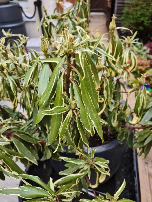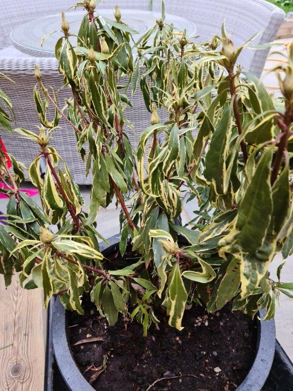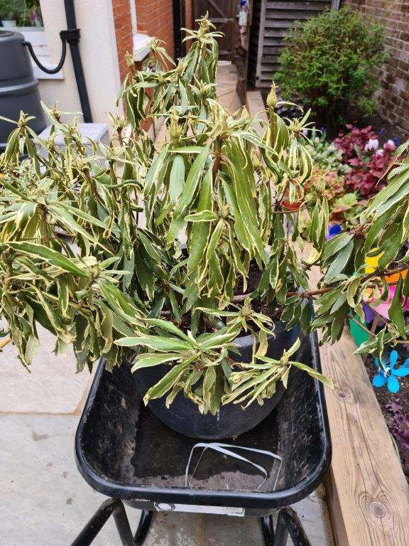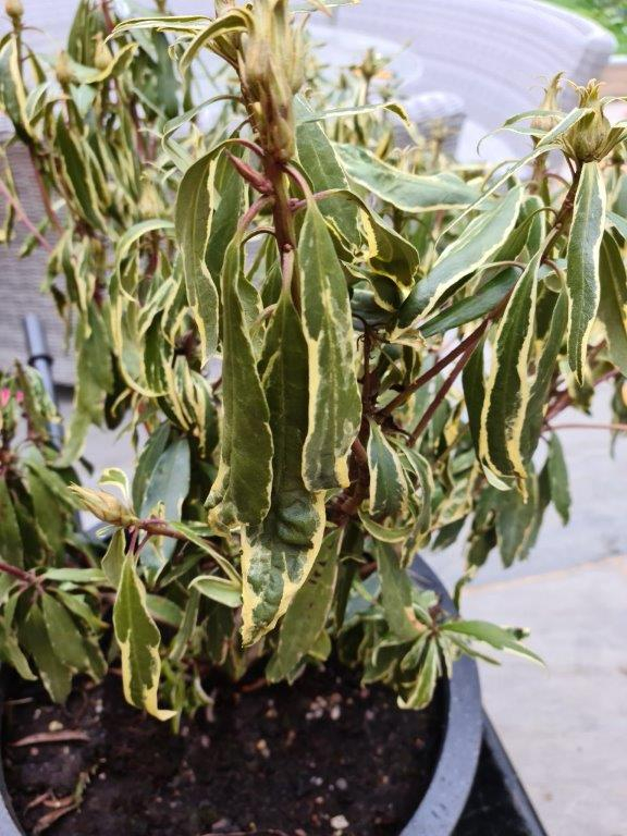 Hi, can anyone tell me what's wrong with my rhododendron? We have two identical plants - silver edge. They were planted at the same time in the same compost and in the same pots. They are about 2m apart in the shade of tall trees to the north of them. The only difference is that the happy one is under the trees whereas the sad one isn't. So maybe it's frost/snow damage? We've moved it into a sunny spot for the last couple of days but that might be making it worse.