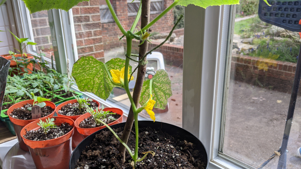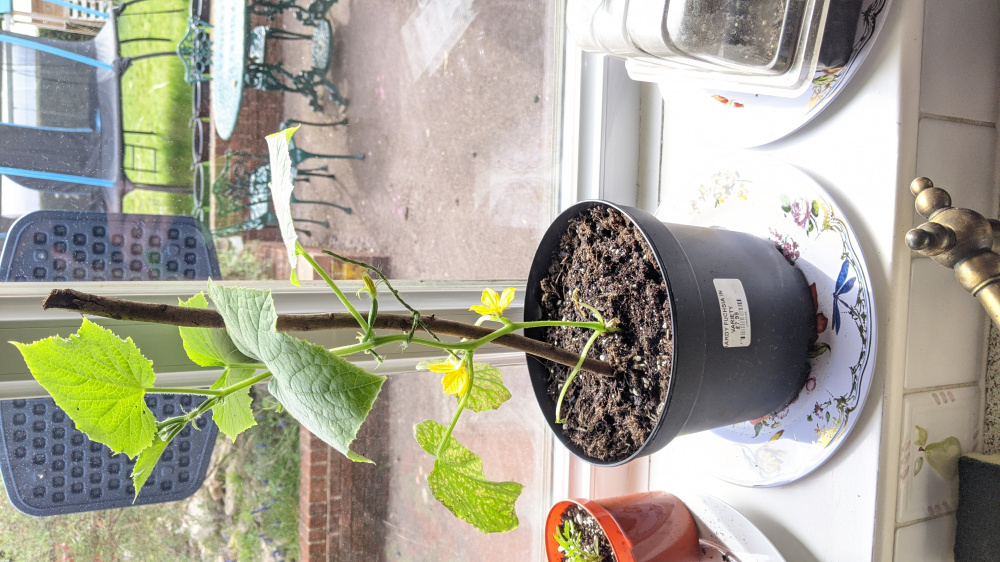 I made a previous post about this cucumber I sowed a bit early. I'm planing to plant in poly tunnel mid May. Last couple of days it has started flowering. I think male ones at bottom, and females with cucumbers at the top.