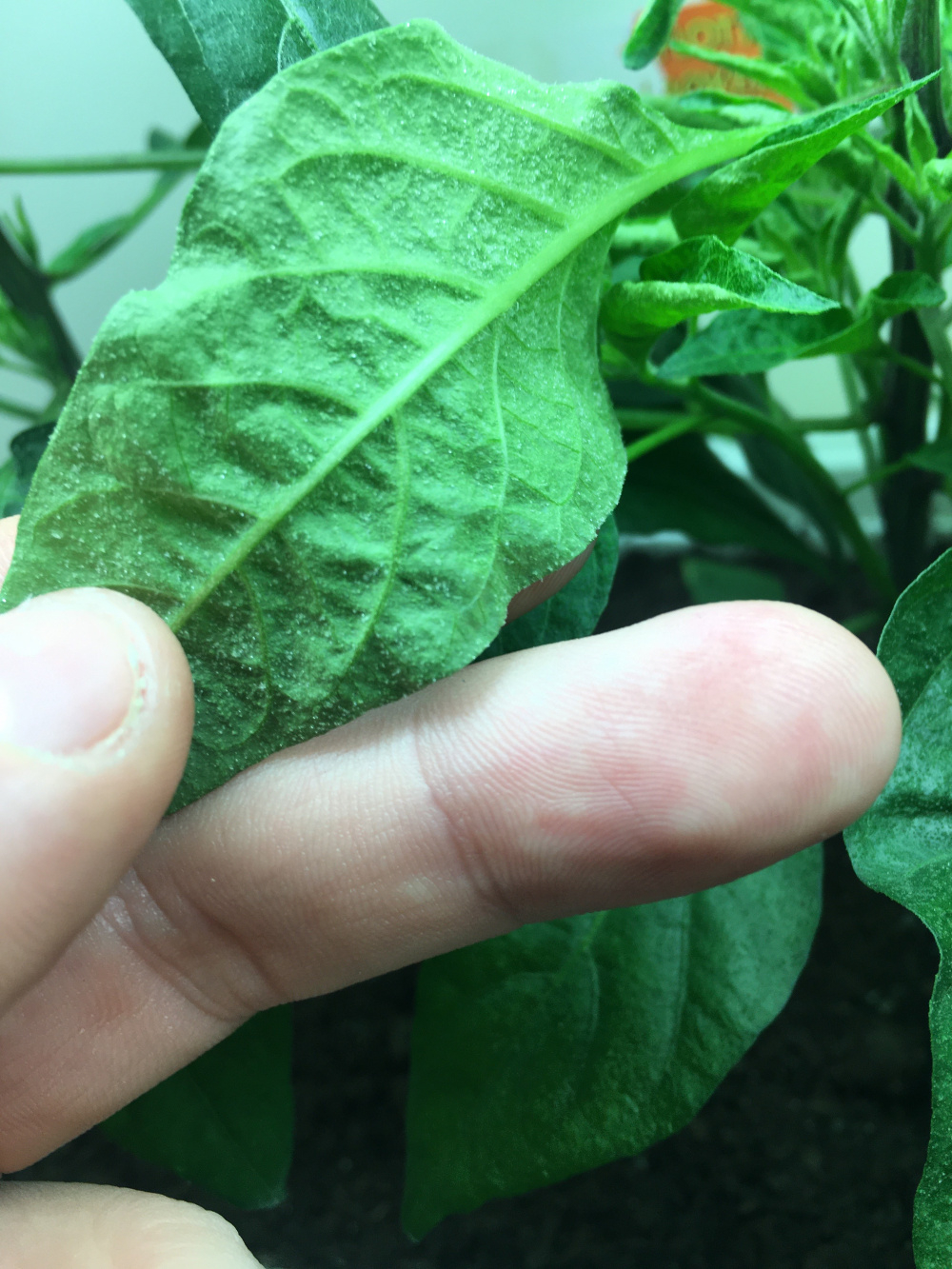 ive spotted some crystal white looking dots on my bird eye chili plants i grow indoors, is this normal, if not how do i fix it? some of the leafes have more then others but mostly all of it have a bit of it on it. It's been growing for about a month now with 16 hours light and 8 hours off.