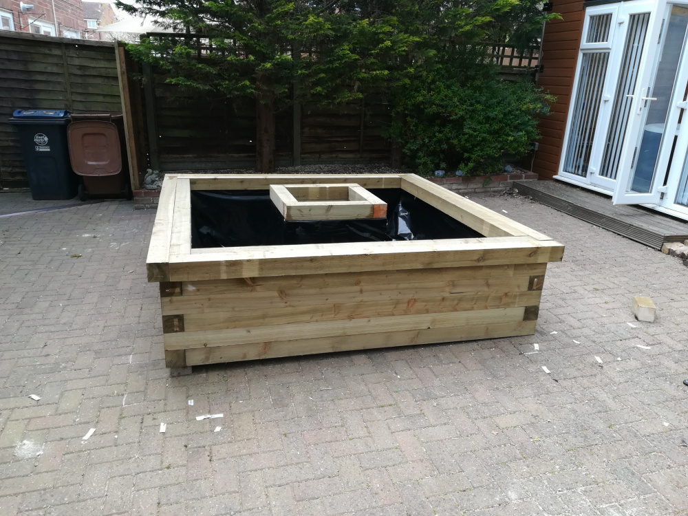 I am looking to build a large wood planter and plonk it in the middle of the space, size will be around 2.1m x 2.1m and I was thinking 60cm high. In the middle will be a wooden box with a self-contained water feature sitting on top to give some movement etc