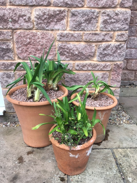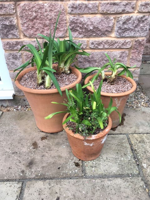 I've given the leaves a trim where they were brown, soaked the rootball in a solution of rainwater and tomorite and potted them up snugly in pots where the rim goes out rather than in! They're against a south facing brick wall that gets sun from early morning until late afternoon. And between you and me I've spoken to them nicely and gently stroked the leaves, but that's just because I love plants and I want them to know it. Daft eh? The one at the front is my existing thinner leaved agapanthus that I've grown from seed planted about 4 years ago. It's never flowered but I think that's normal when grown from seed. Just imagine if they all flower this summer...