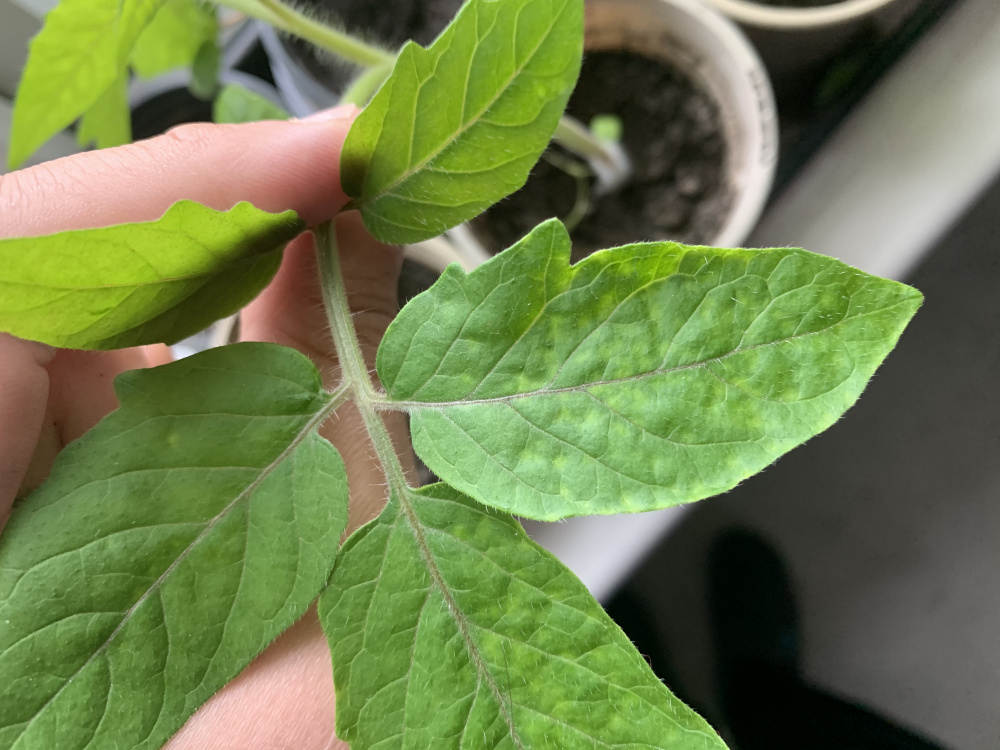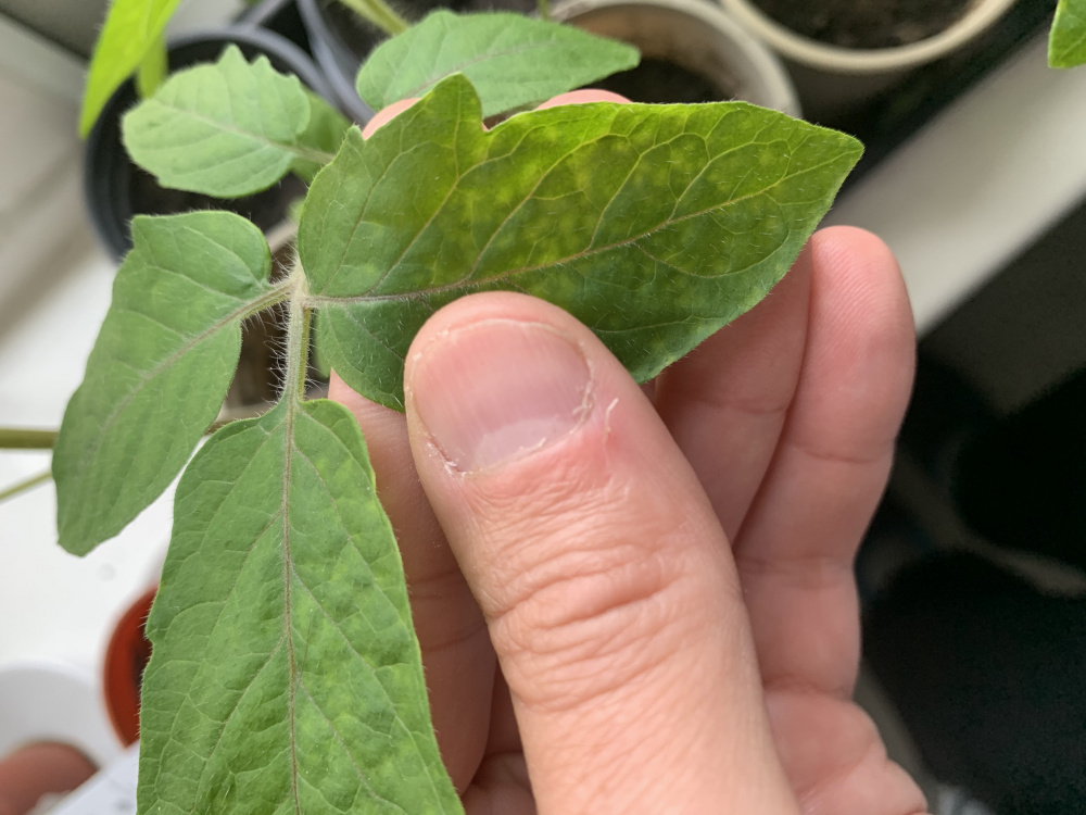 i have some tomatoes indoors, I did sow the mmm back in March, and I have found some discoloured spots in some leaves. Any idea what might be the problem?
