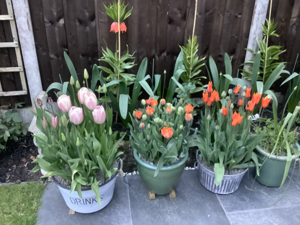 I keep potted tulips covered over winter [piece of glass or similar] to keep the worst of the weather off them. Once it's warmer and a bit drier [usually once they're poking through] I keep them against a wall to keep excess wet off them, and then pop them into their position. I've grown two new varieties this year [ from Nyssens] and both have performed well. The Flyaway ones are looking good just now. They've been watered once - twice at most, as April has bee unusually dry here.
