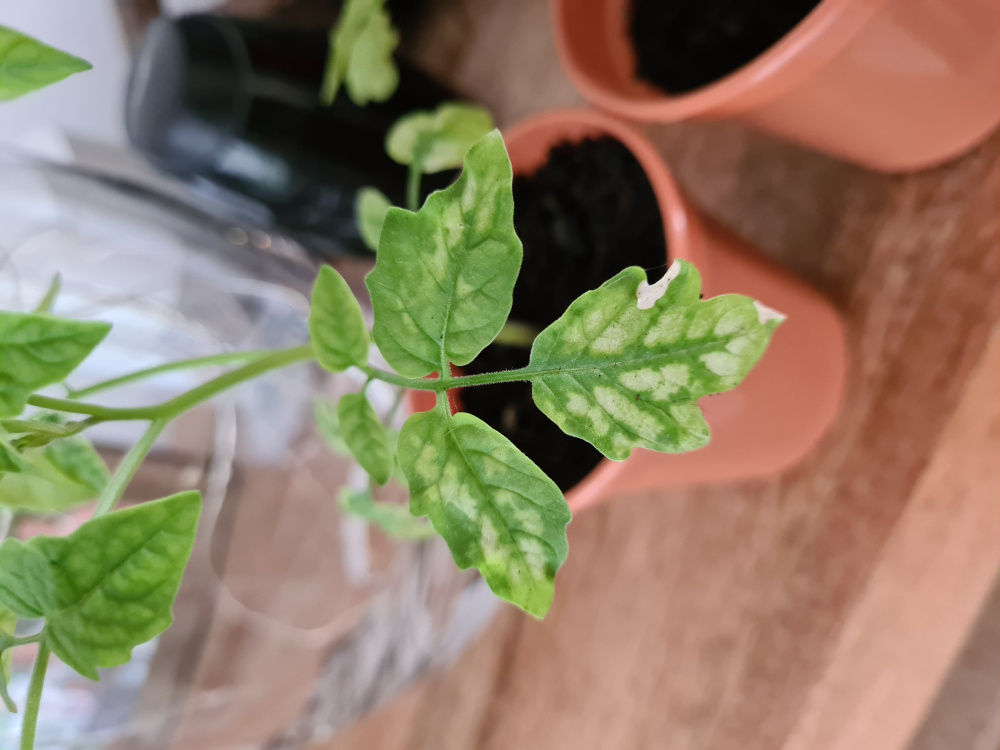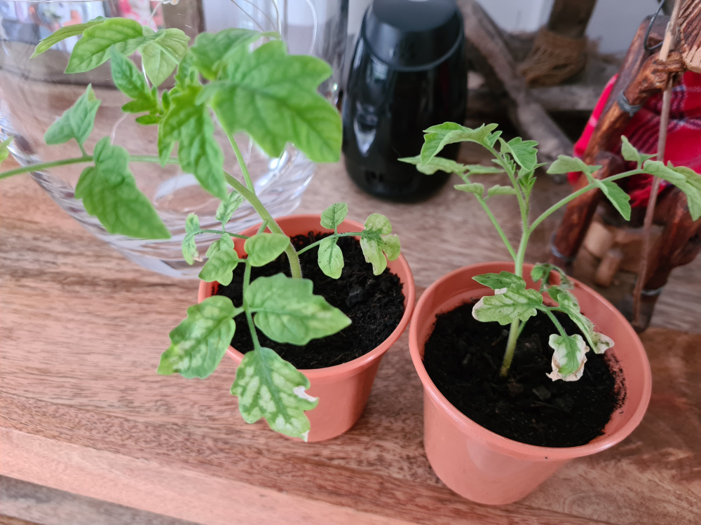 We have some cherry tomato plants growing from seed indoors and noticed a few leaves have started yellowing and drying out.