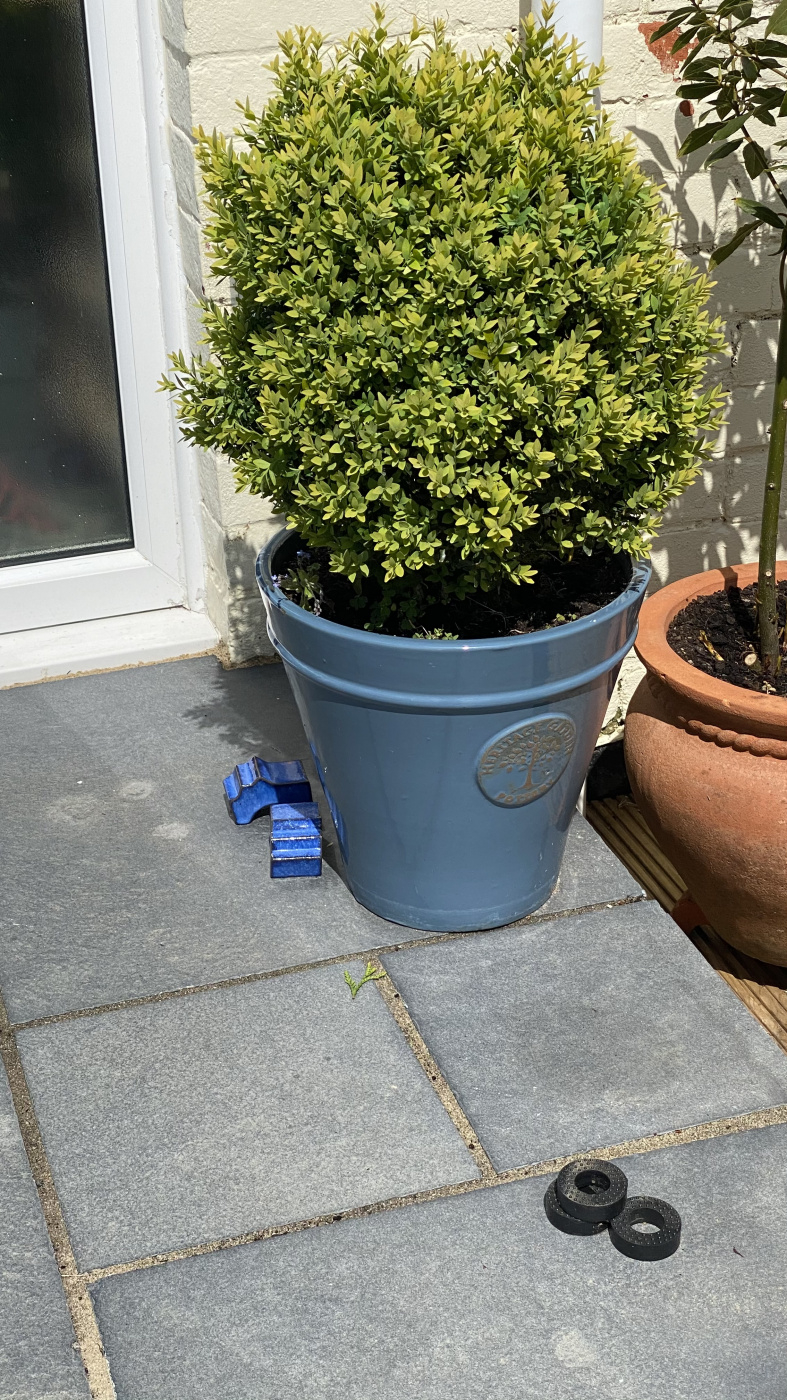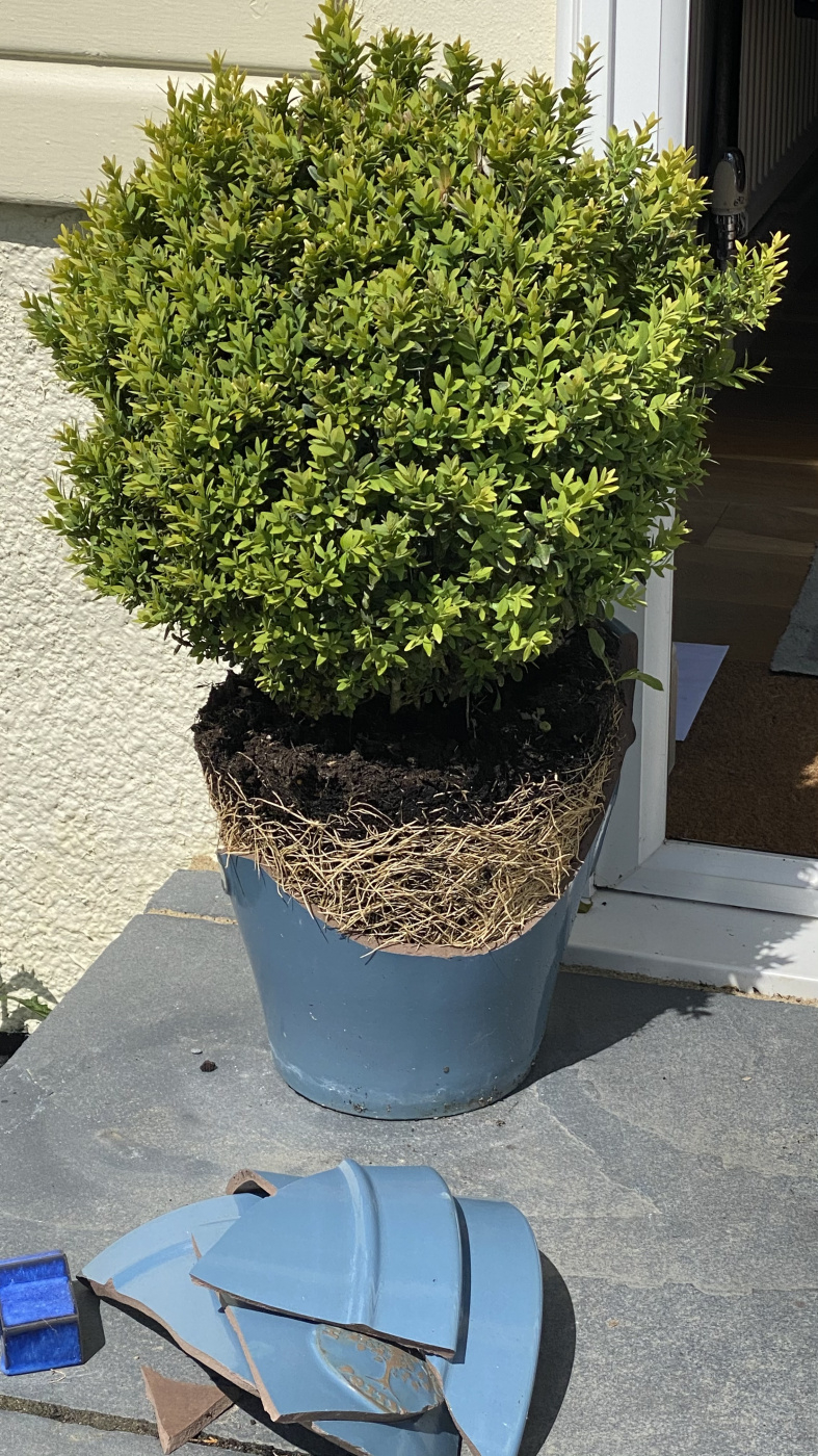 Please can you advise me what to do about my potted box plants. The wind smashed one of them at the weekend and I’m very disappointed.