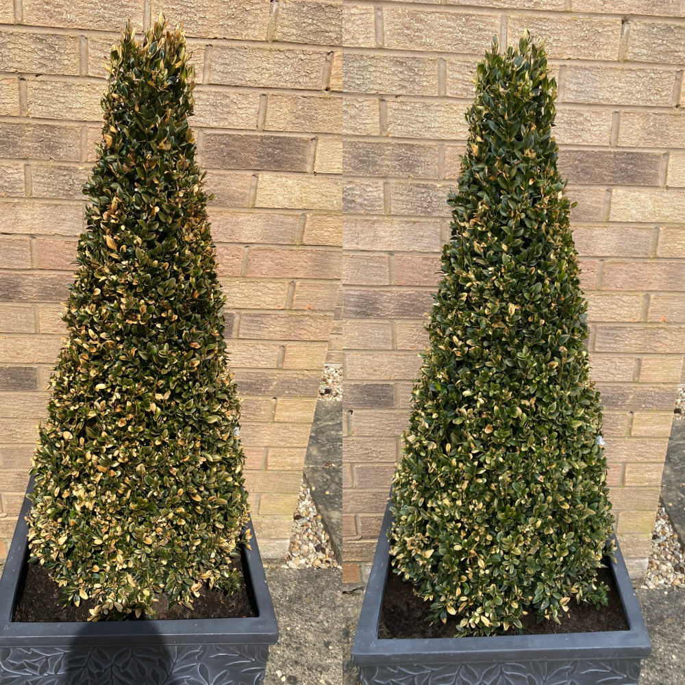 Hi, I recently bought 2 pyramid shaped Box Trees plants roughly 1m tall to put into pots next to my South facing front door. I haven't pruned them at all since I took delivery. Since I potted them out the leaves are slowly going yellow but not falling off! I have watered them through the dry spell. I'm rather afraid I've killed them off already. Can anyone advise. the attached picture is the same plant, the left hand side is today, the right hand side 3 weeks ago. Thank you!!!