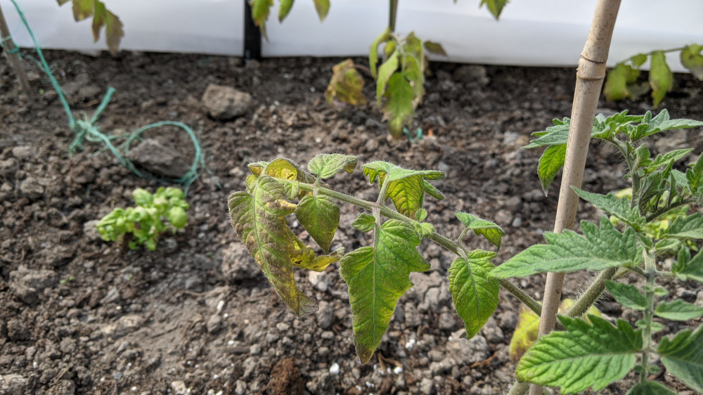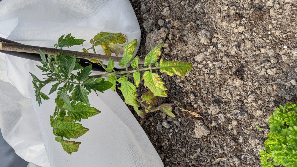 Not sure if this is from the cold , under watering or over watering or just old age. Could it be early blight? There aren't really spots as such which I believe are blight symptoms.