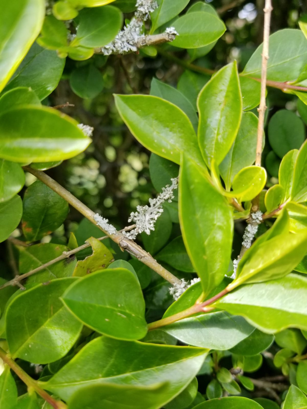 Hello everyone, I've recently noticed some white spots growing on the branches of the shrub in my garden. May I ask what they are and what should I do about them? Thank you in advance.