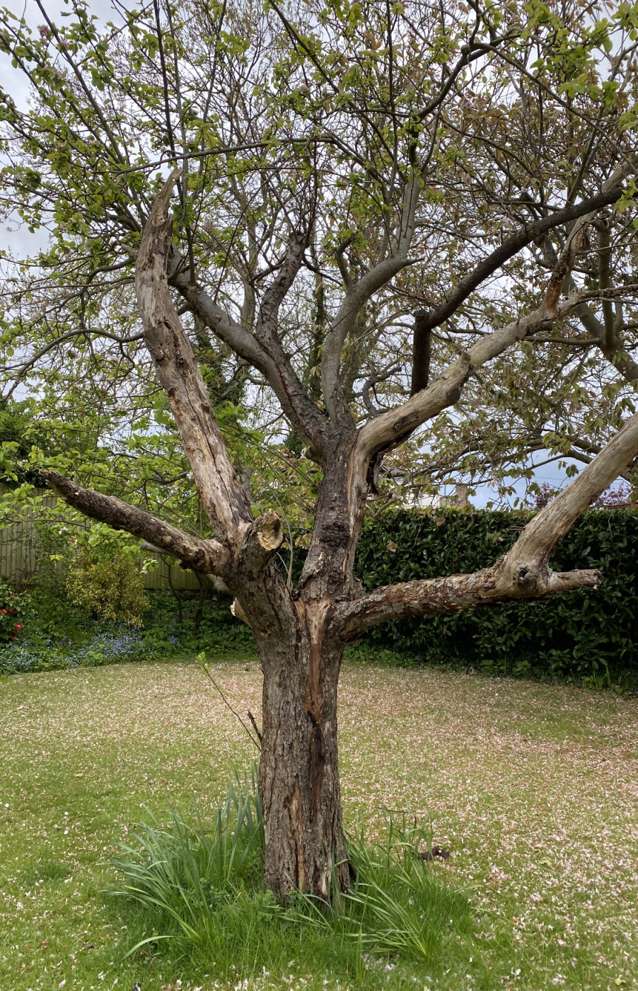 Hi, we moved home this year and have inherited an apple tree which looks to be half alive, half dead. Easy as it might be to say I’ll just cut off the dead branches, I’m wondering whether this might be terminal given the damage to the main trunk.