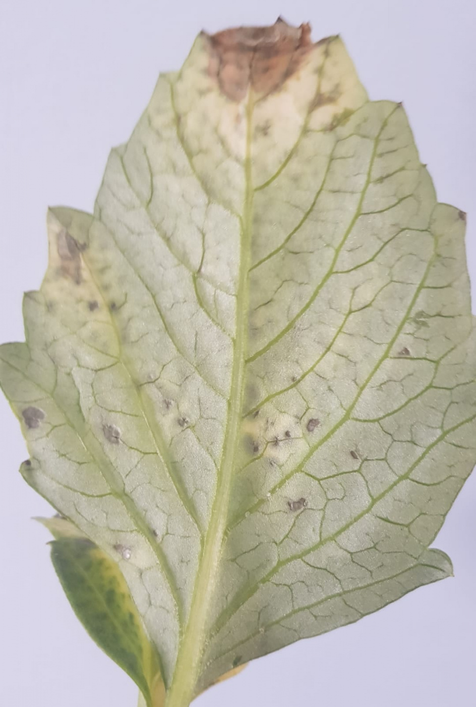 Only today, I notice 3 leaves (including two young ones) at the bottom of the plant turned yellow/grey and wilted. Another one close to the bottom started having quite some small grey spots on it.