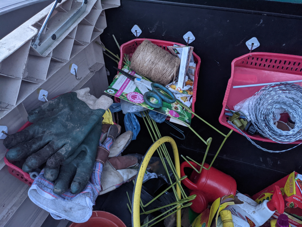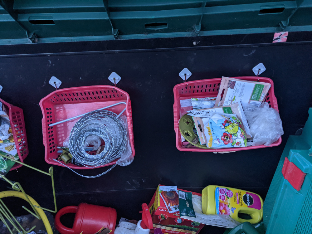 For a long time now I've been trying to find ways to store smaller items in our Keter box to no avail. I originally tried to glue hooks and use storage baskets and finally after many attempts I found some glue strong enough to hold the hooks/baskets.