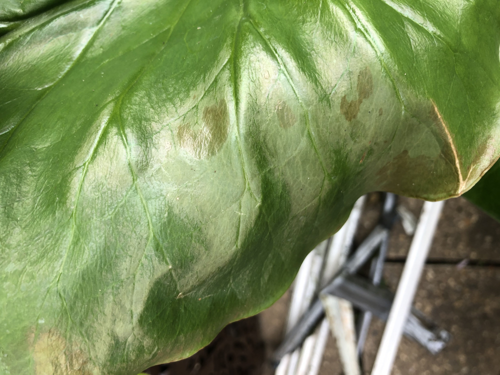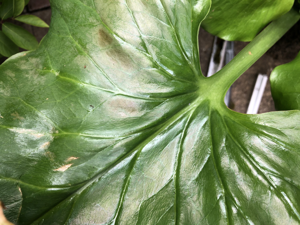 Does anyone know if this is sunburn on my giant lily leaves? I was told this could be placed in full sun but now I’m not so sure. It’s not frost damage.0