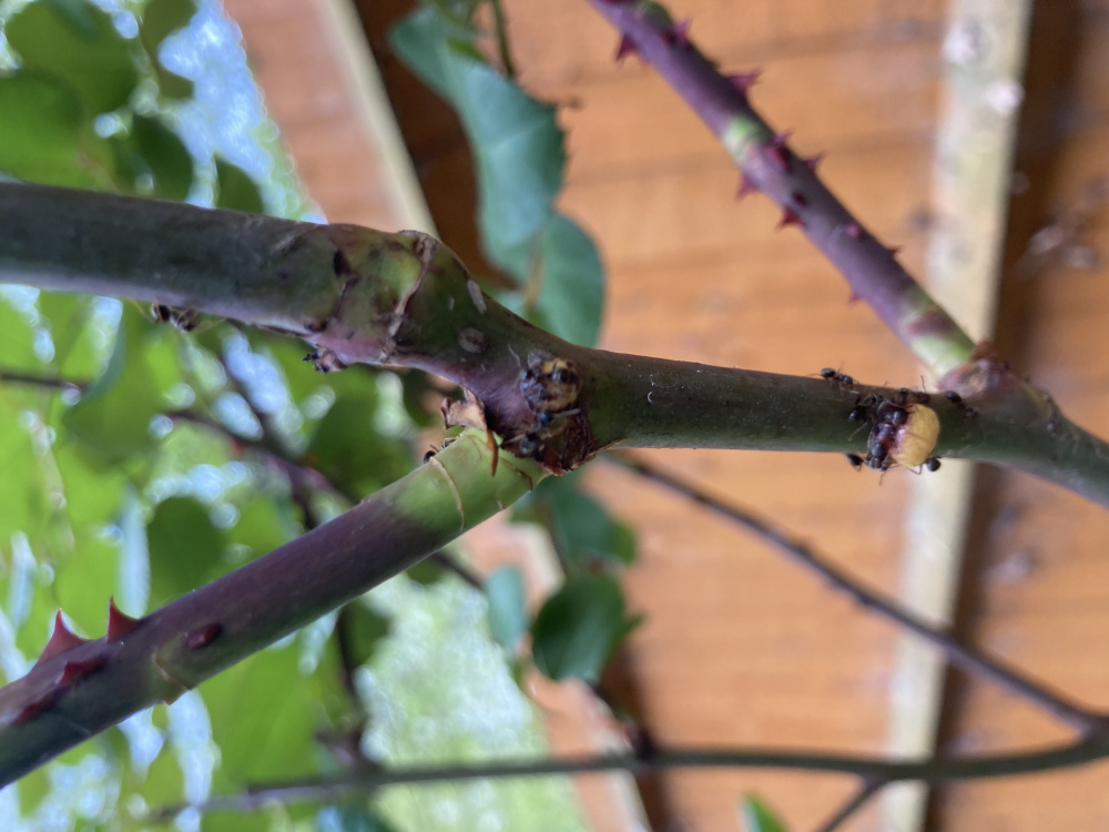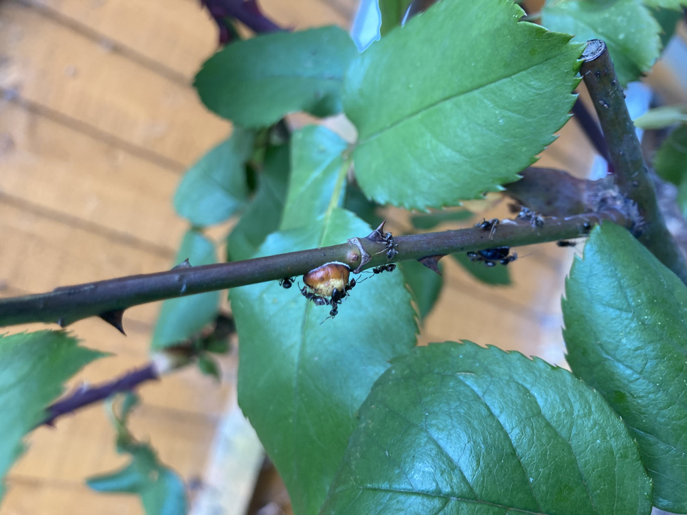 Hi I have a small number (<10) of quite big yellow scale insects on a rose plant in North London, surrounded by ants. Can anyone help identify these?