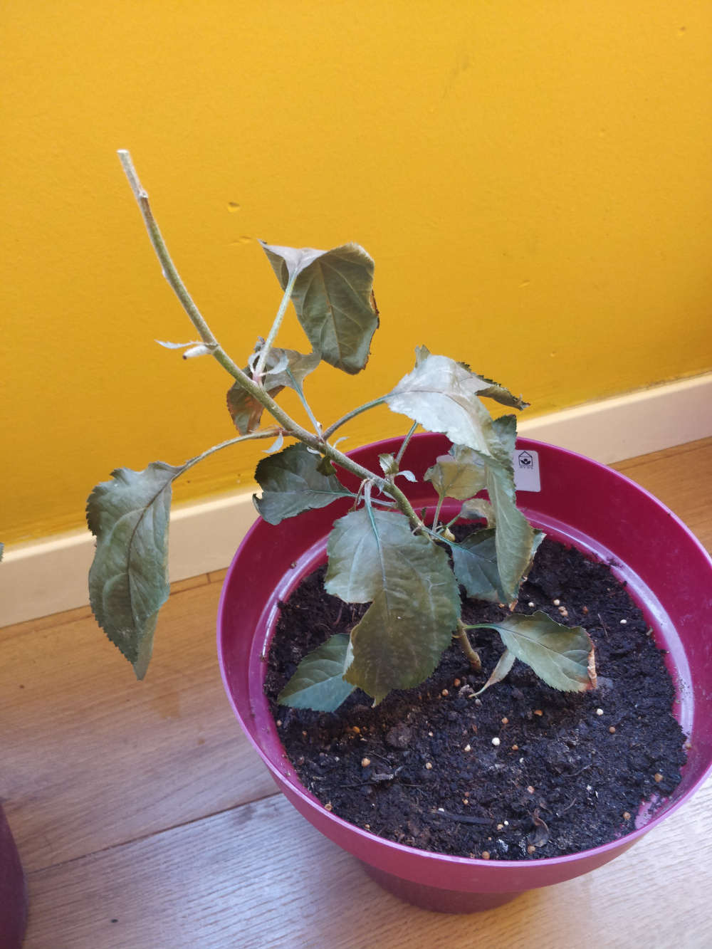 I have two apple plants which are a few months old, and a couple days ago their leaves started to wilt the branches are getting thinner and can't hold them anymore.There has been construction work near me lately and they got a lot of white dust on them, I washed it of with a water sprayer and moved them inside, but it doesn't seem to help.