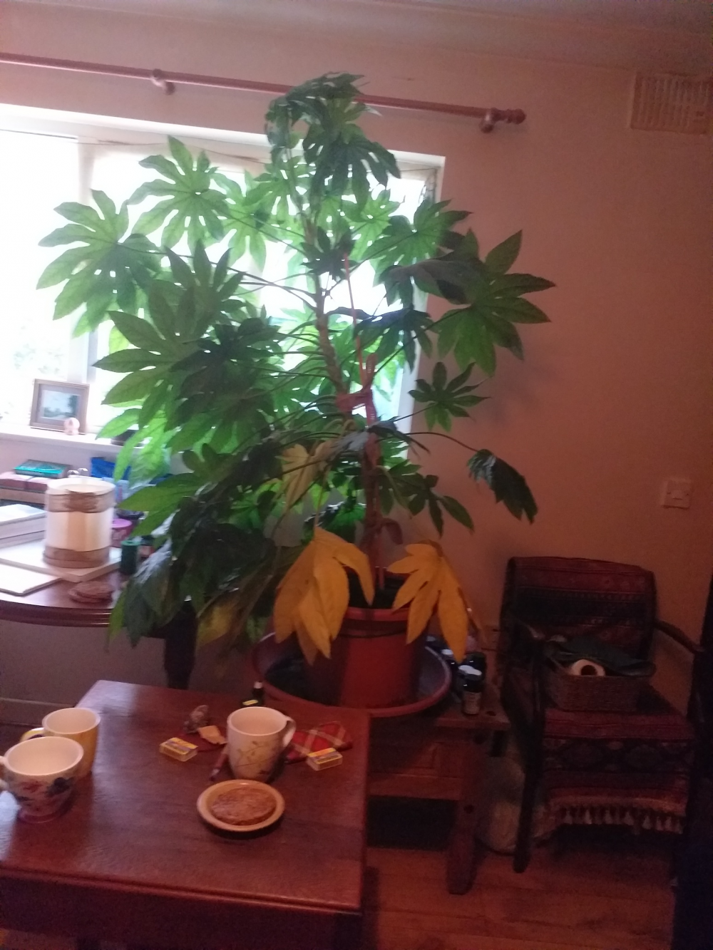 This is my friends Castor oil plant. When I go and visit her it looks terrible dry it now has some yellow leaves I got her to add more water Its about 107 cm tall to the top of the stem or 42 inches. Last year I gave it some well rotted manure on the top and then covered it over with soil out of the garden so that it would not stink. I think I need to do this again. Anna has a problem with bright lights so likes this plant to shade her. Should we prune the top if so how much