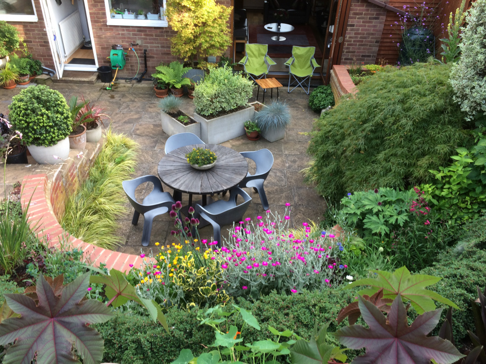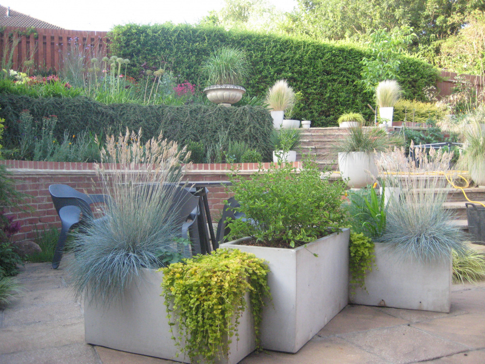 Here are some photos to show you how we have used planting/pots/troughs to soften our patio/stairs/terracing.