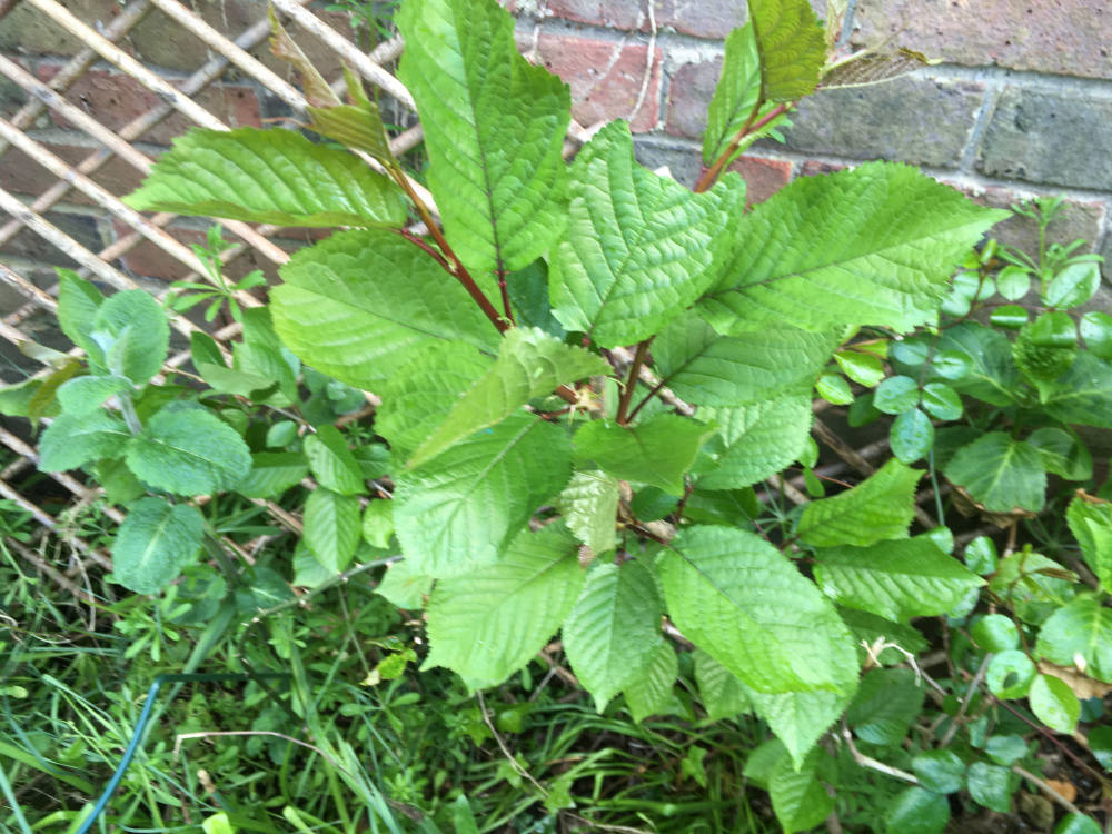 Hi - this is growing next to my hydrangea - I think it's a cherry self seeded, and I should remove because it's right next to my neighbours wall.