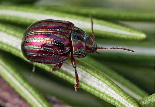 This is a rosemary beetle. They can be irridescent green too. They'll eat sage as well. I've has them and vigilant squashing works eventually.