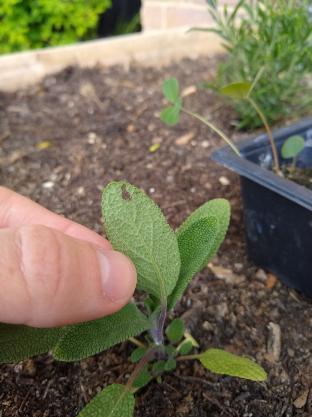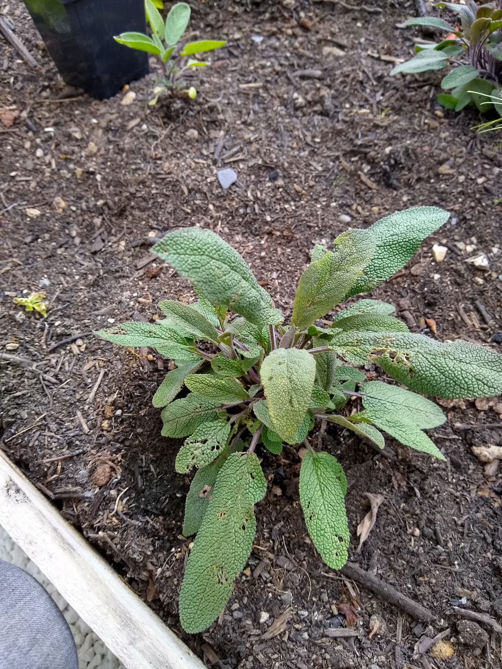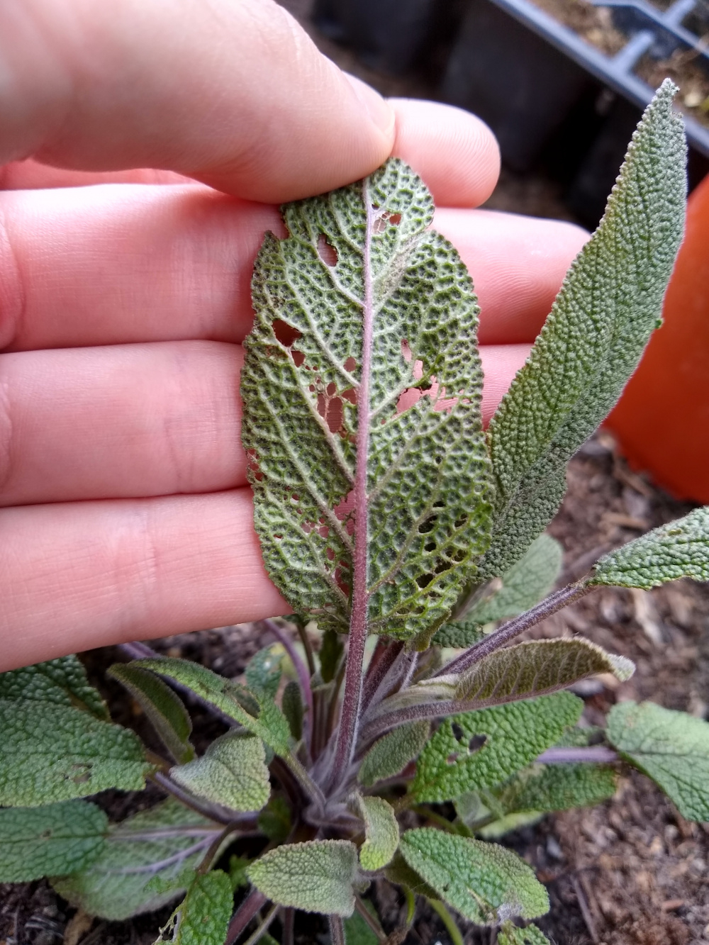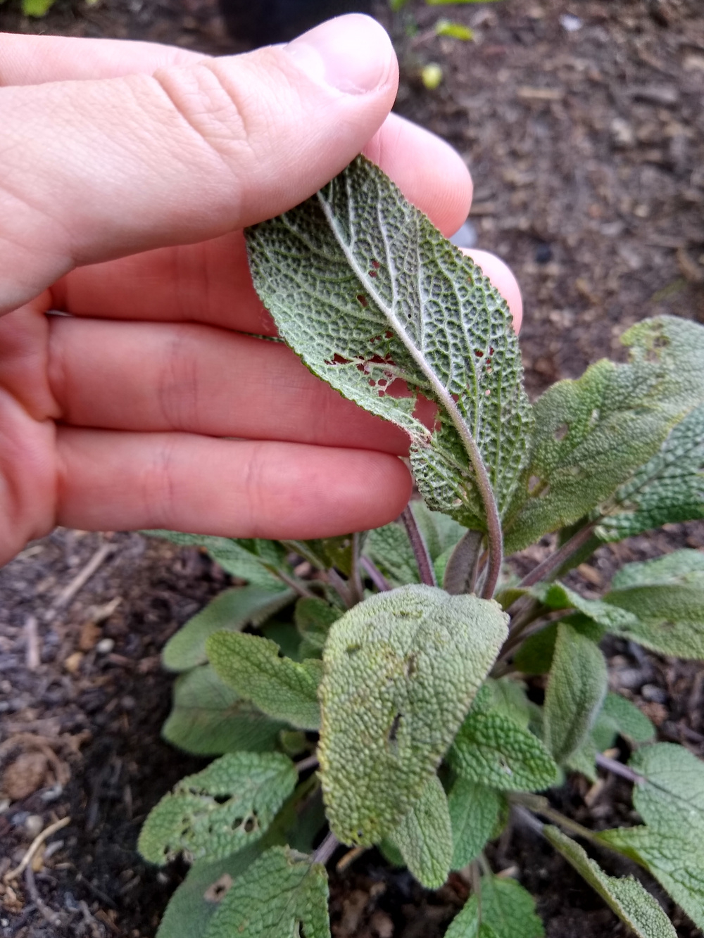 My sage (salvia officinallis 'Berggarten' and 'Purpurascens') have been eaten quite extensively over the last few days (3 purple sages were the main choice, with two young and newly hardened off common sages having a few bites taken out of).