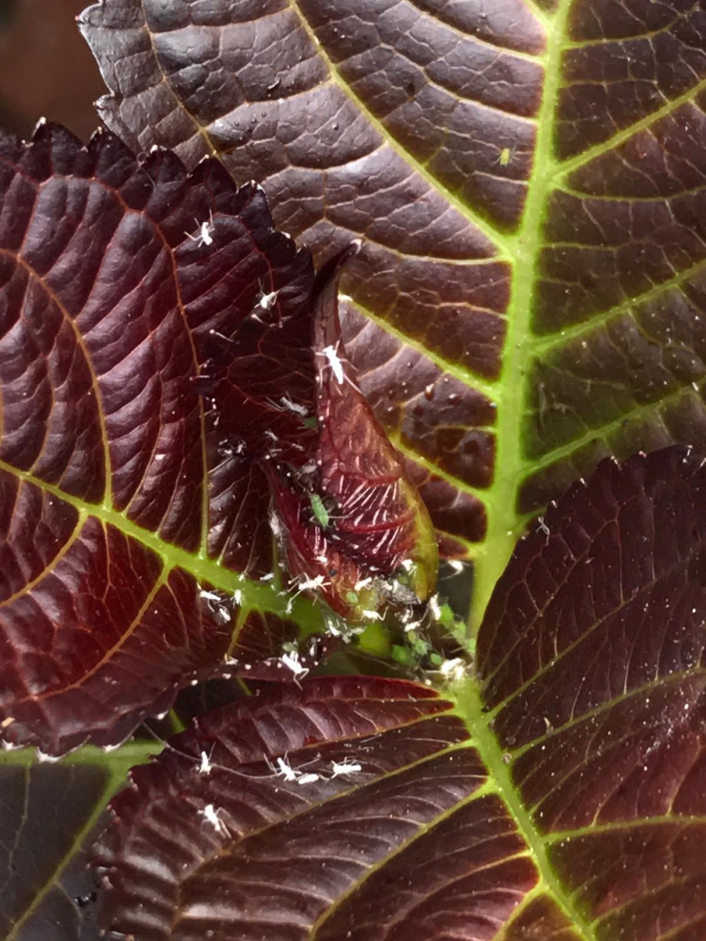 Can anyone help me identify this bug growing on my hydrangea please? When I looked it up I thought maybe it's scale because most of them are white, but it doesn't quite look like the photos to me. Are they green flies? I'm new to gardening so apologies if it's something obvious! Thanks!