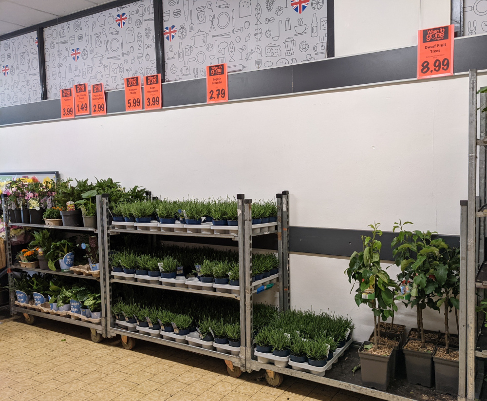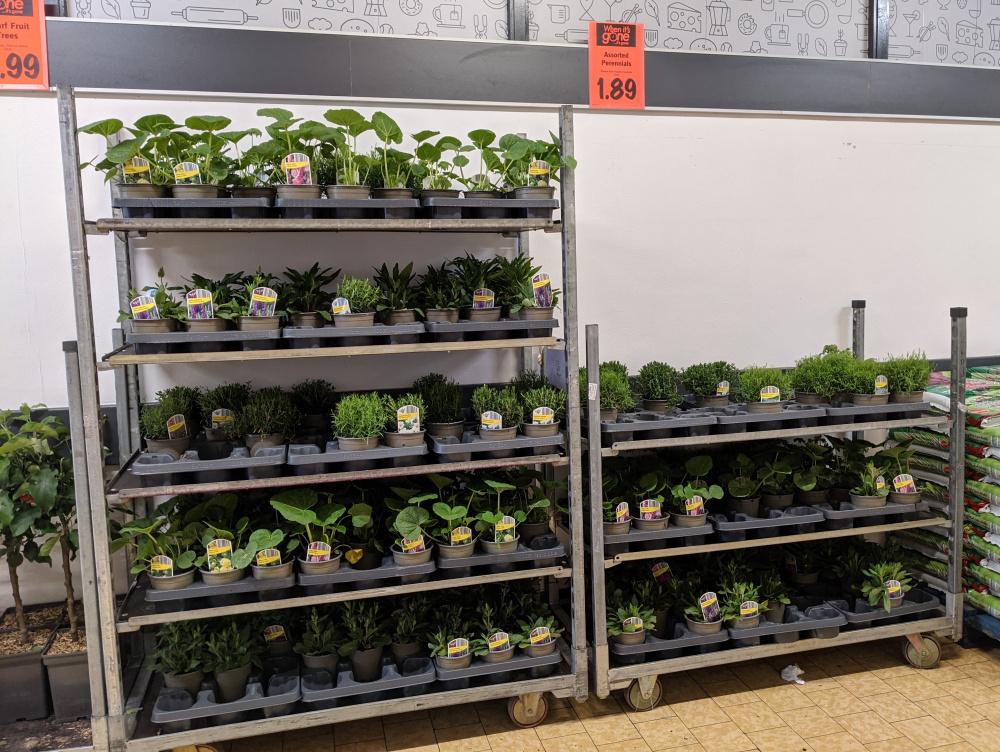 Perennials (Salvia, hollyhock, Arenaria, can't remember what else) £1.89 at Lidl, plus houseplants £3.99 I think and some lavender, Echinacea etc.