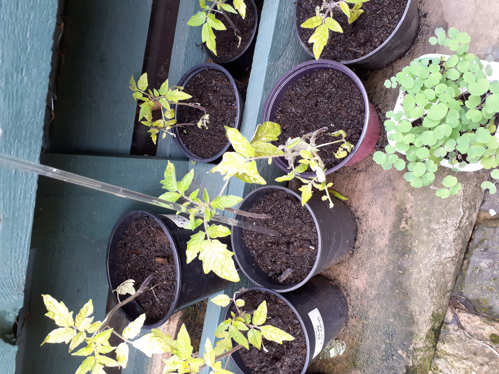 Just as an aside - if you have those very small tomato plants outside, even for a few hours - it's too cold for them virtually everywhere in the UK. That's probably why they're so yellow. They need double figures at night.
