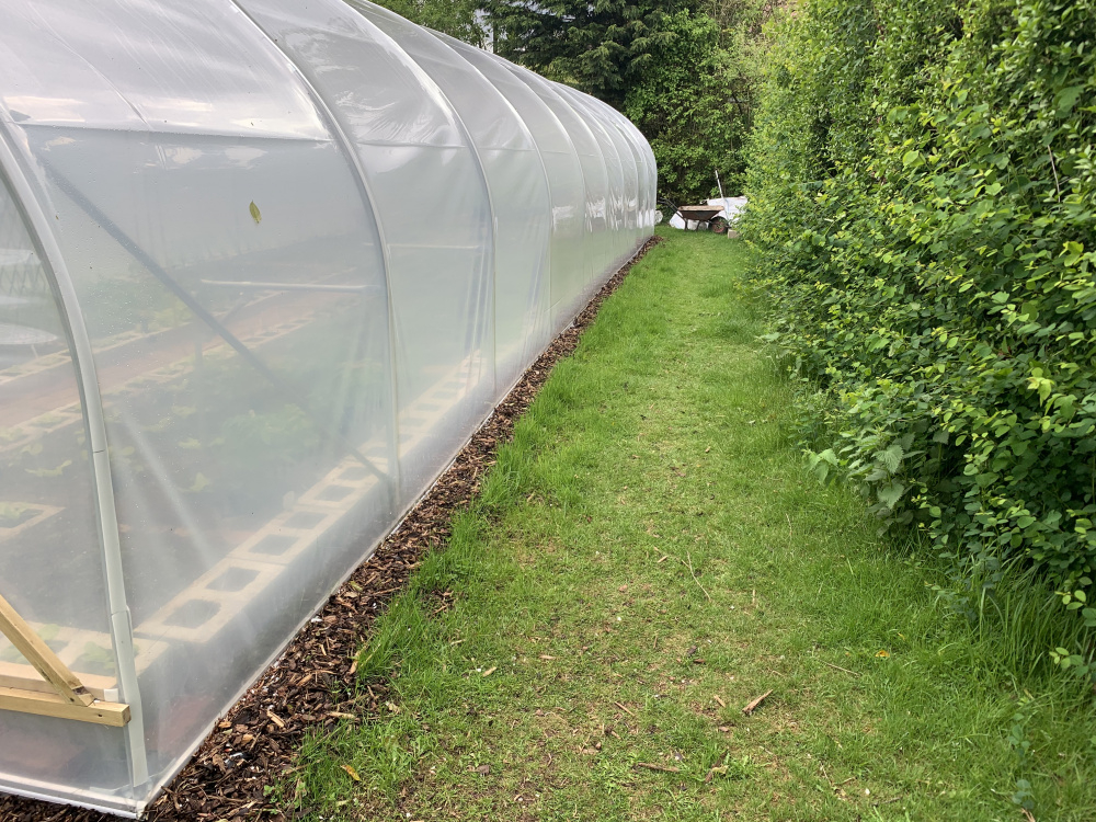 I would like to kill the grass next alongside my Pollytunnel.I’m worried that if I use my push lawn mower I’ll kick up some chopped bark and damage the polythene.