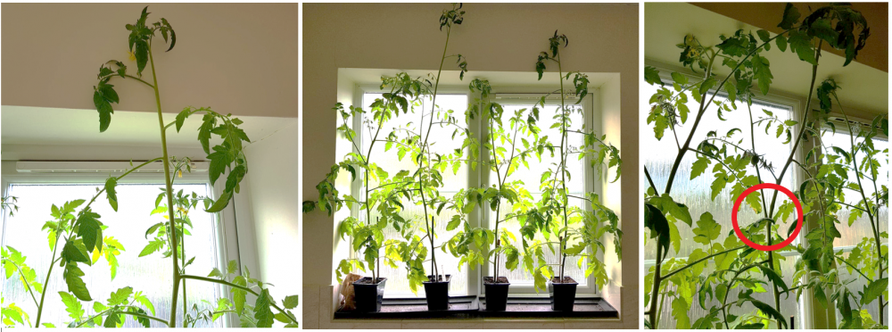 P.S. Pots are too small and they need much, much more light. Those stems aren't going to hold the weight of a truss of tomatoes