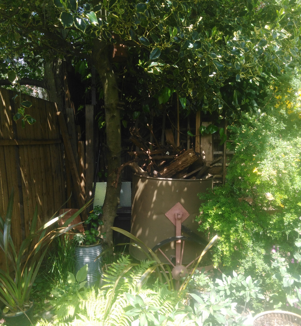 I have a holly tree at the end of a small garden next to a bowser and a large bush behind which I store old bits of wood, boxes of paint, tools etc Most of it is hidden but I need something that tolerates shade, fast growing and tall to hide the stuff behind the holly. Grasses, a bush,