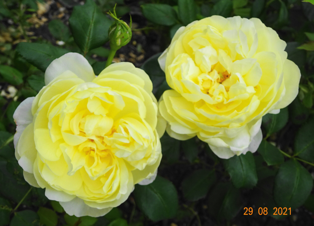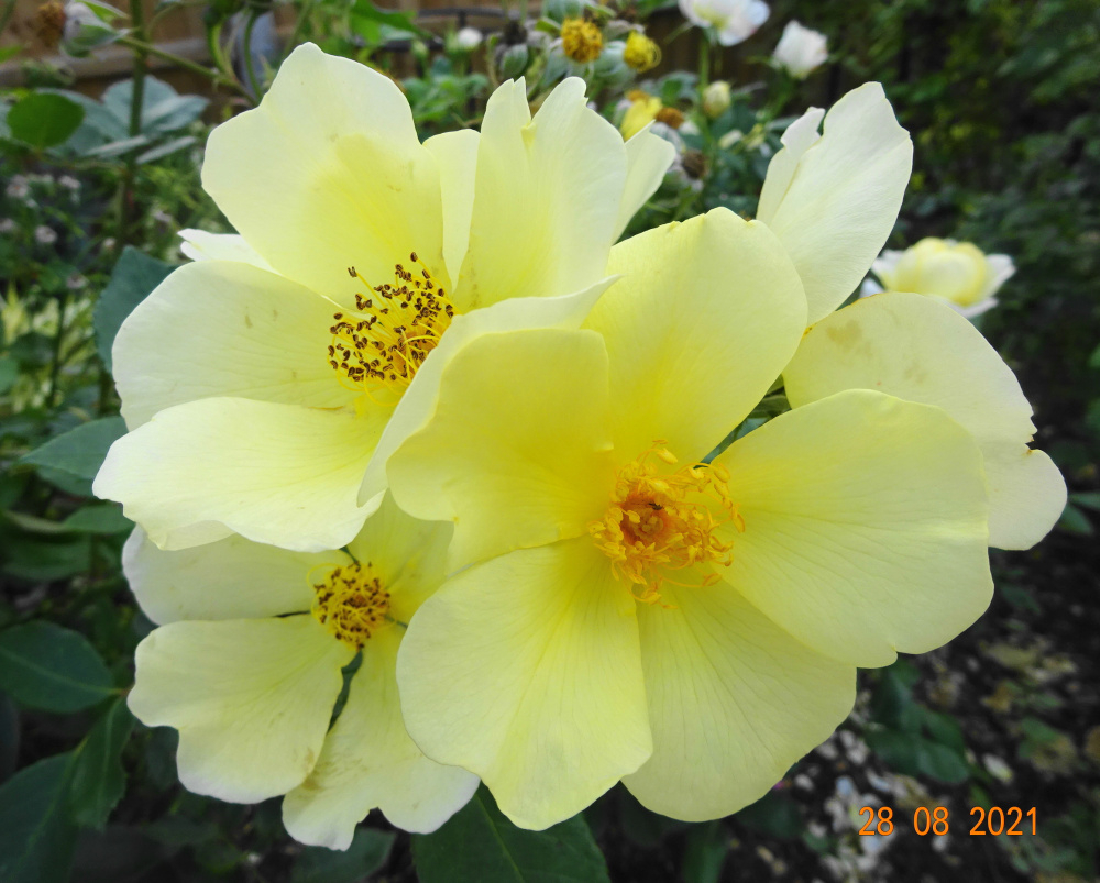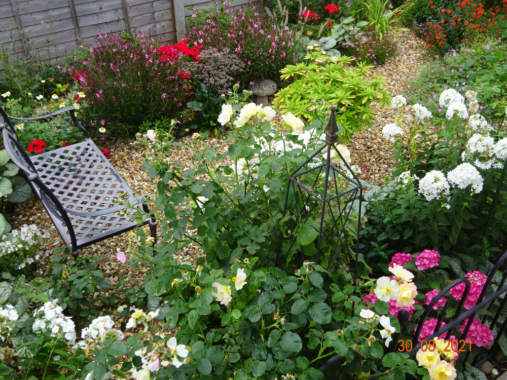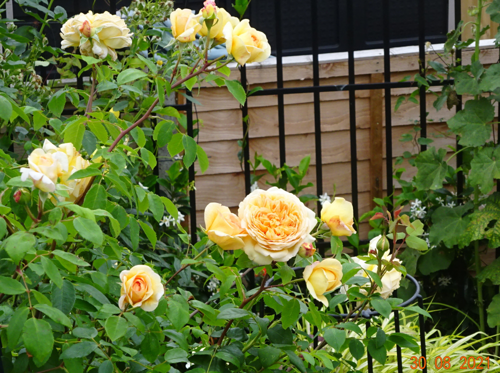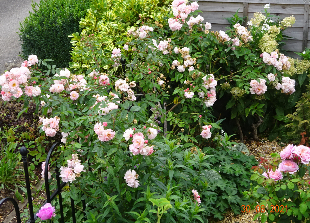'Vanessa Bell' in the foreground.. a pale shadow of last year when in a pot.. needs copious watering and feeding to look its best.. like so many Austins..