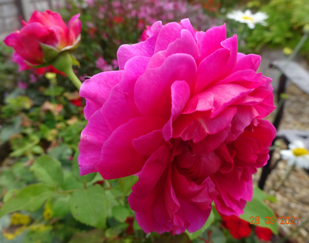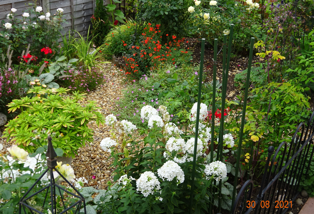 I like striking hot colours here and there.. and don't mind too much if they clash.. Alonsoa 'Rebel'.. a tender perennial.. ..developing hips on Tottering by Gently.. the plant is a whole mass of these as I stop deadheading at this point.. ..'Cornelia'.. I like it because it's thornless and always repeats well.. 'Desdemona'.. surely the best Austin white.. ..still some colour going on in this area..