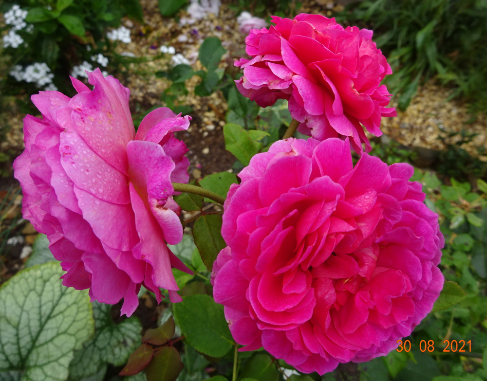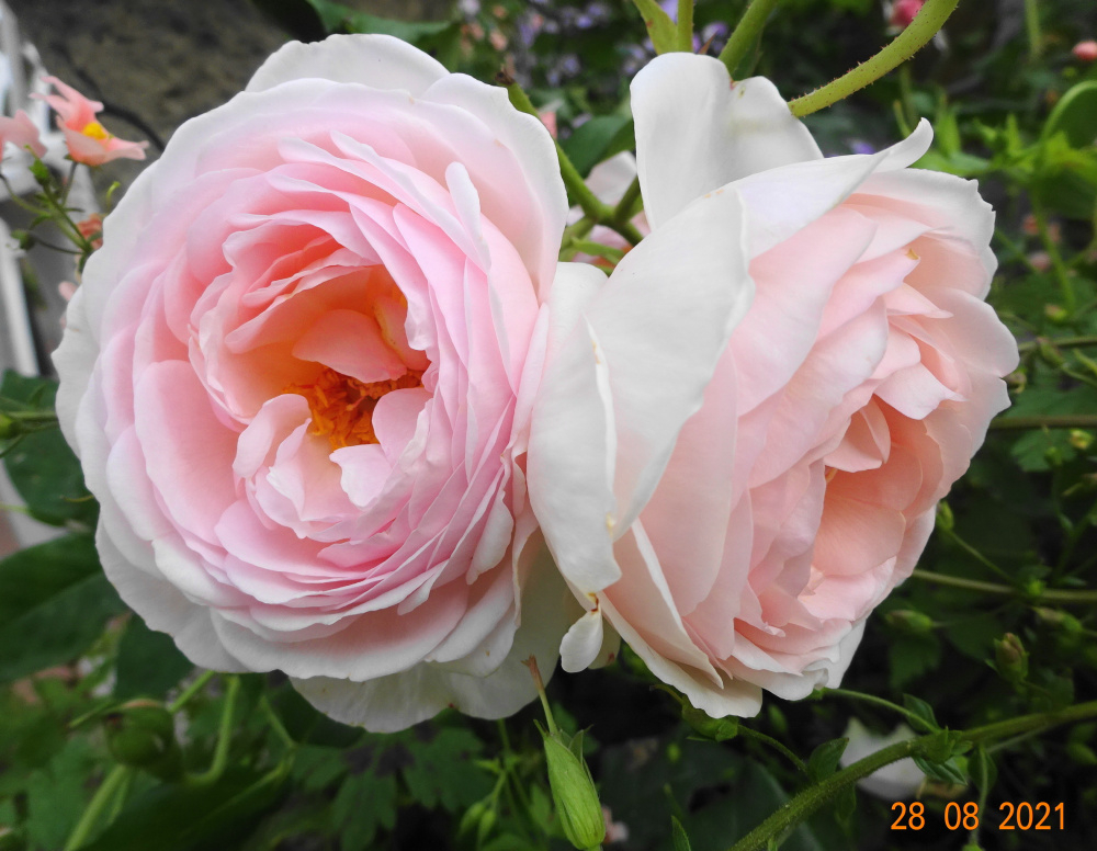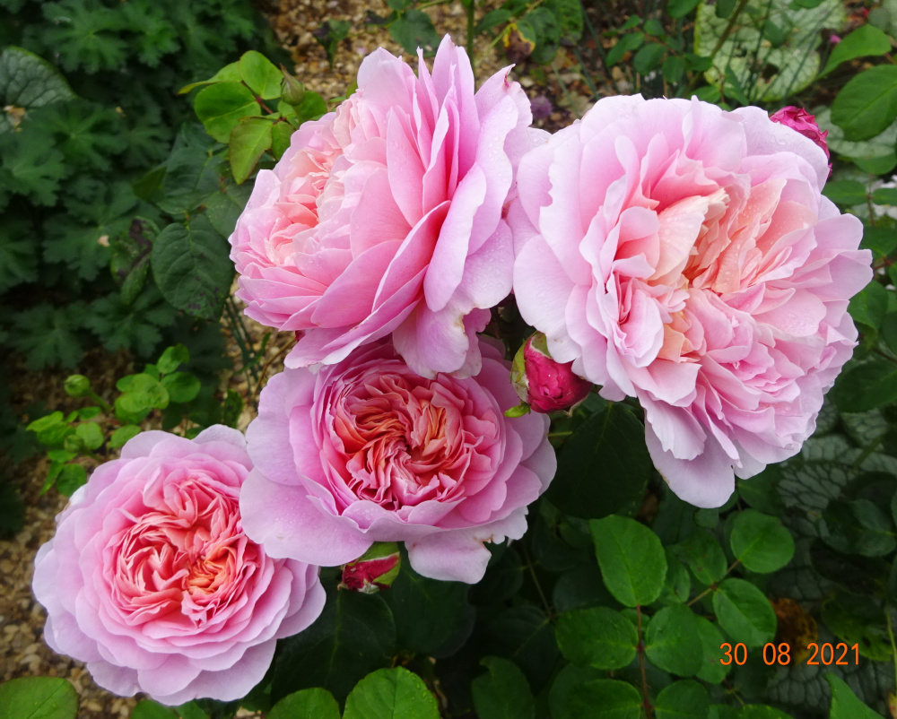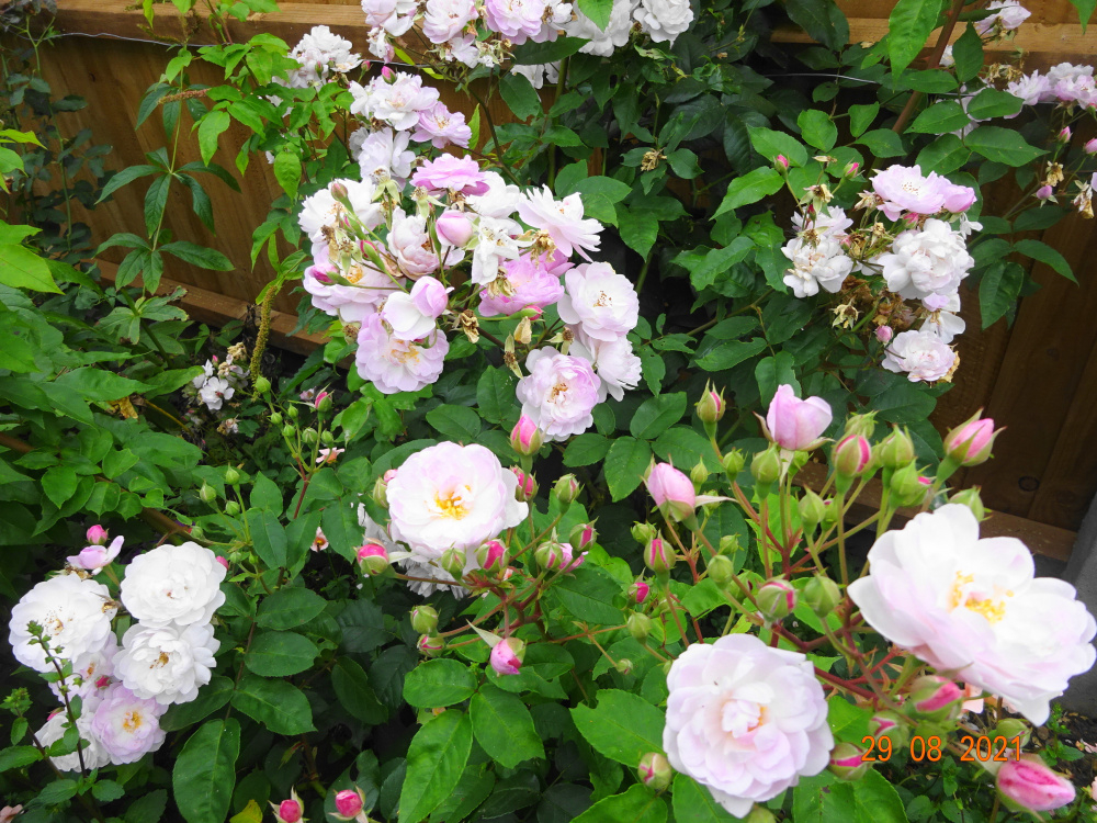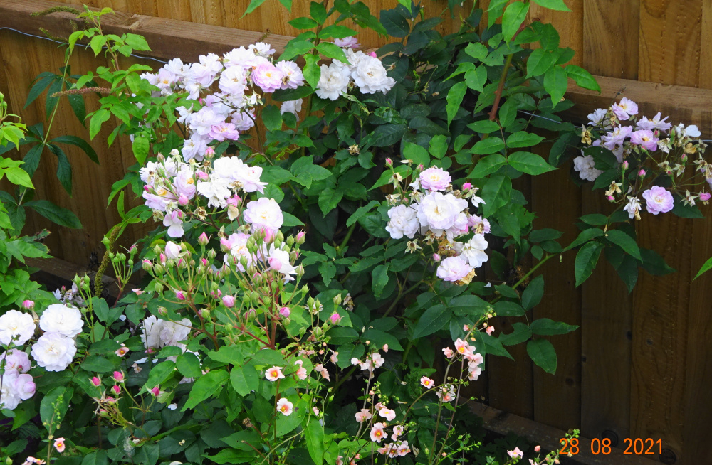 'Gabriel Oak'... smaller blooms but the scent is wonderful today... of cloves, from both the stamens and petals.. 'Tottering by Gently'.. this has set masses of hips which I shall leave on.. exquisite bloom on 'Gruss an Aachen'.. 'New Zealand'.. this has recovered with good foliage.. I shall probably keep it, it was earmarked for removal.. 'Blush Noisette'.. recovering from storm damage earlier.. 'Heritage'.. a very good Austin with strong scent, and quick to repeat..