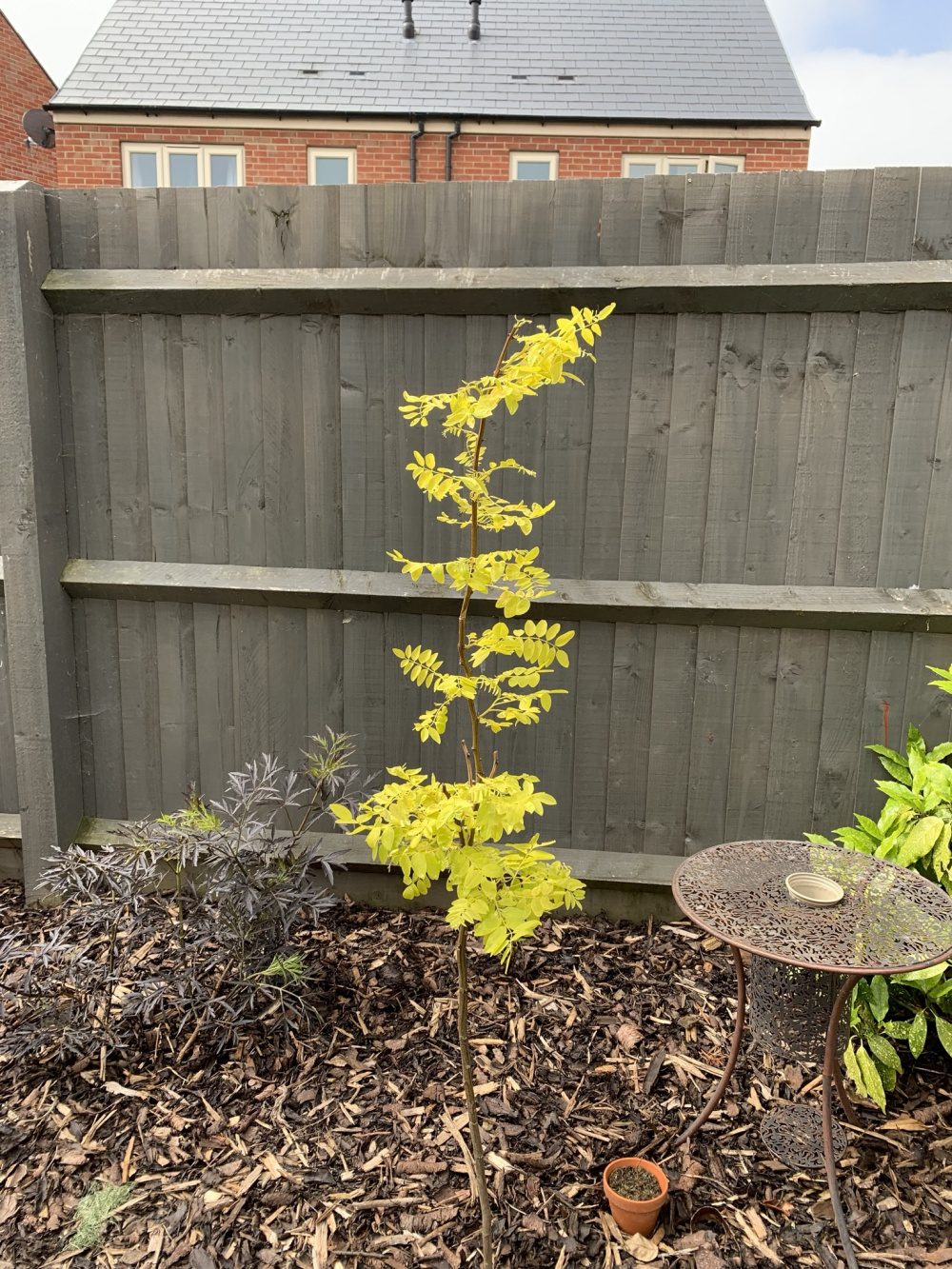 The sambucus you have (very close) to it will outgrow the robinia in no time and form a big shrub up to about 2.5-3m high if you don't prune it