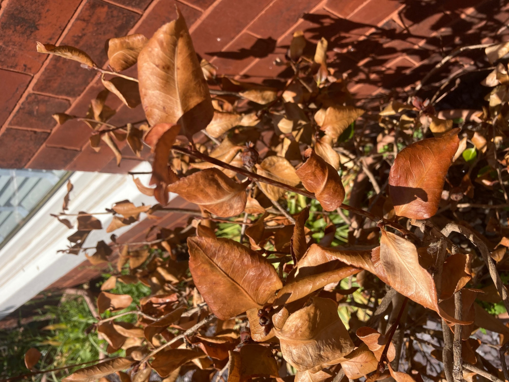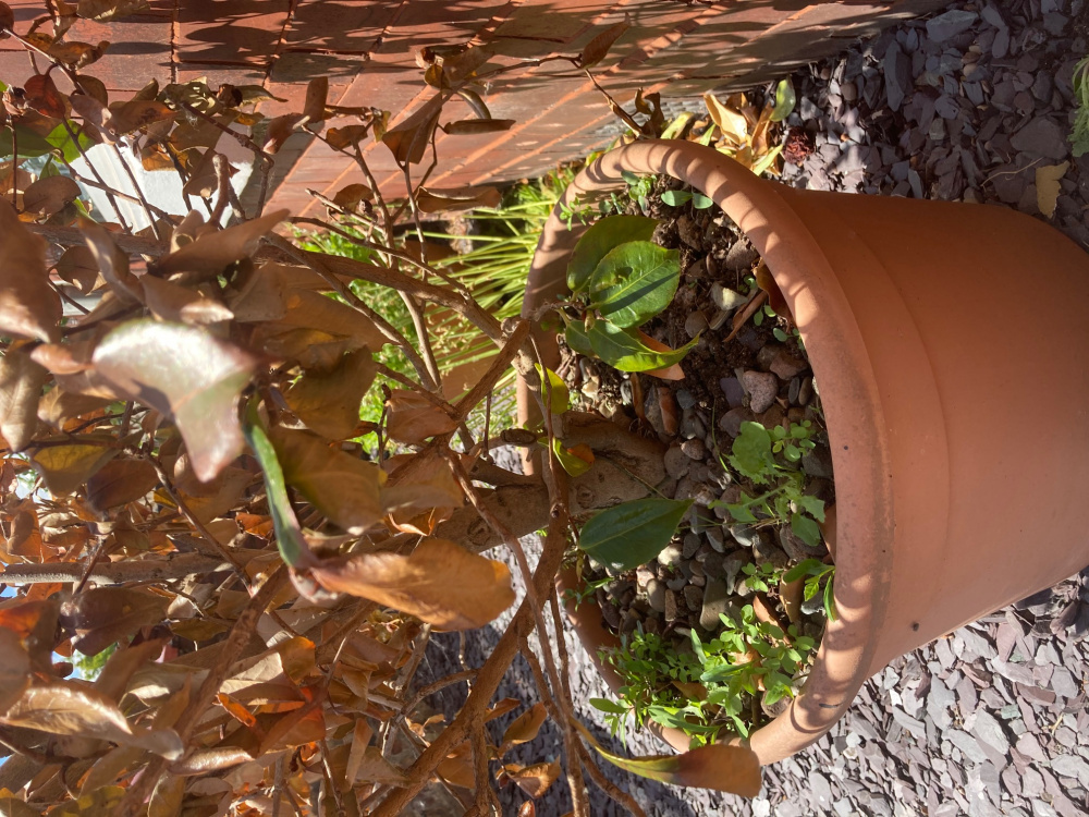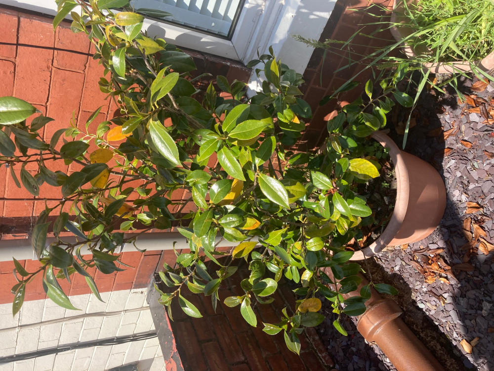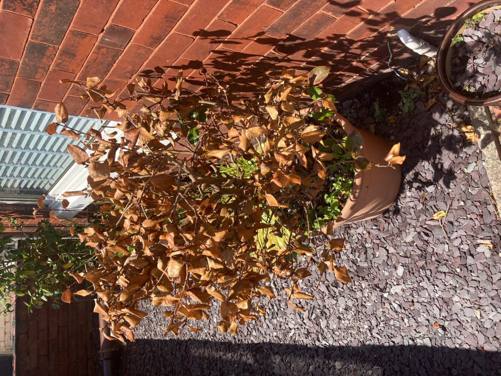 Hello all, i have inherited a cpl of Camelia from a recently passed relative. They have always been in the pots but were located on turf and the roots had grown through the bottom of the pots. these have now been re-located to my house, still in the pots but on slate chippings. Both have been abundant with growth and flowers but as you can see one has just turned brown, this seemed to co-