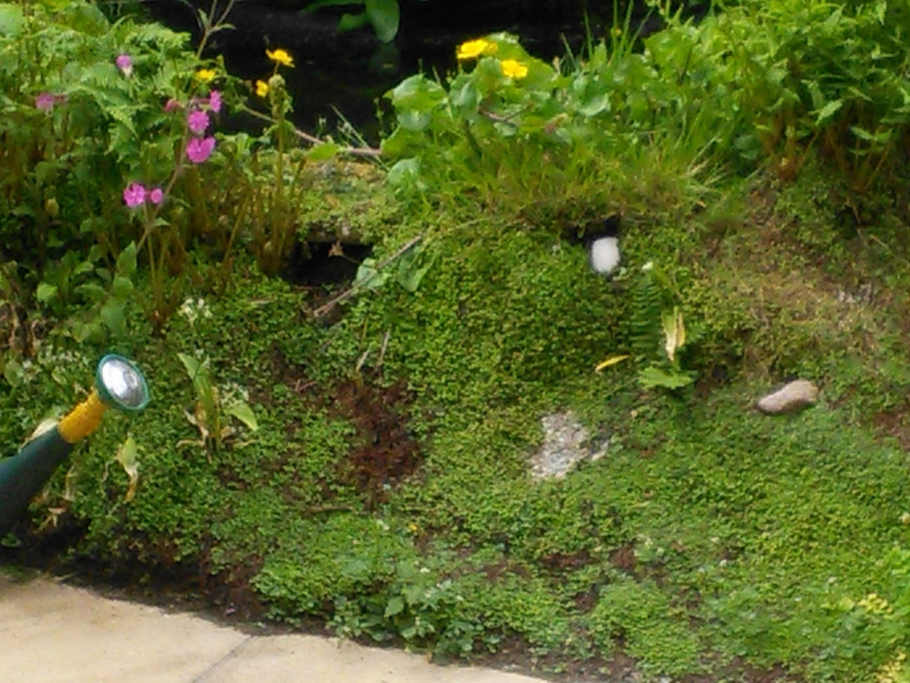 Can anyone identify what creature is coming out of this hole at night and leaving drag marks on the growth by the pond? I have checked , but no poo around that looks like rat lol, which is what I am DREADING,living on my own at 75 years old ! I can't stay up all night watching, and don't have a camcorder--- I have seen a big toad and hears it under the pond, hoping it's him
