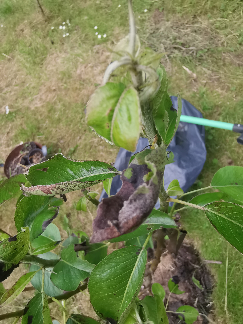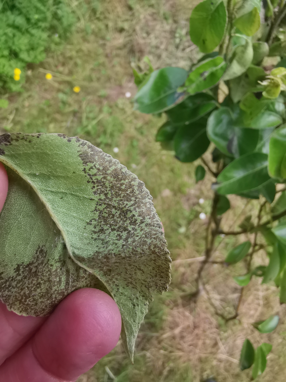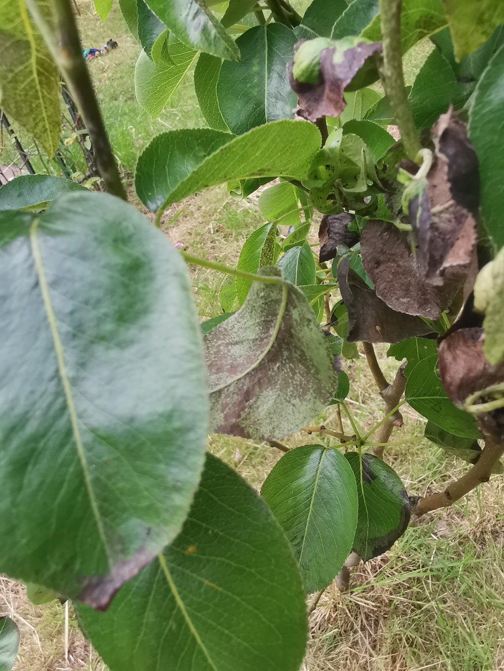 I have a couple of very young pear trees and a lot of the leaves are looking quite unhealthy in places and are quickly turning black. I planted them last summer. I'd greatly appreciate some suggestions as to what it can be and how to treat it. When I gently rub the underside of the leaves a white fluffy substance comes away. I think I might have a few different problems going in with them as you can see from the photos. Thanks in advance for any advice.