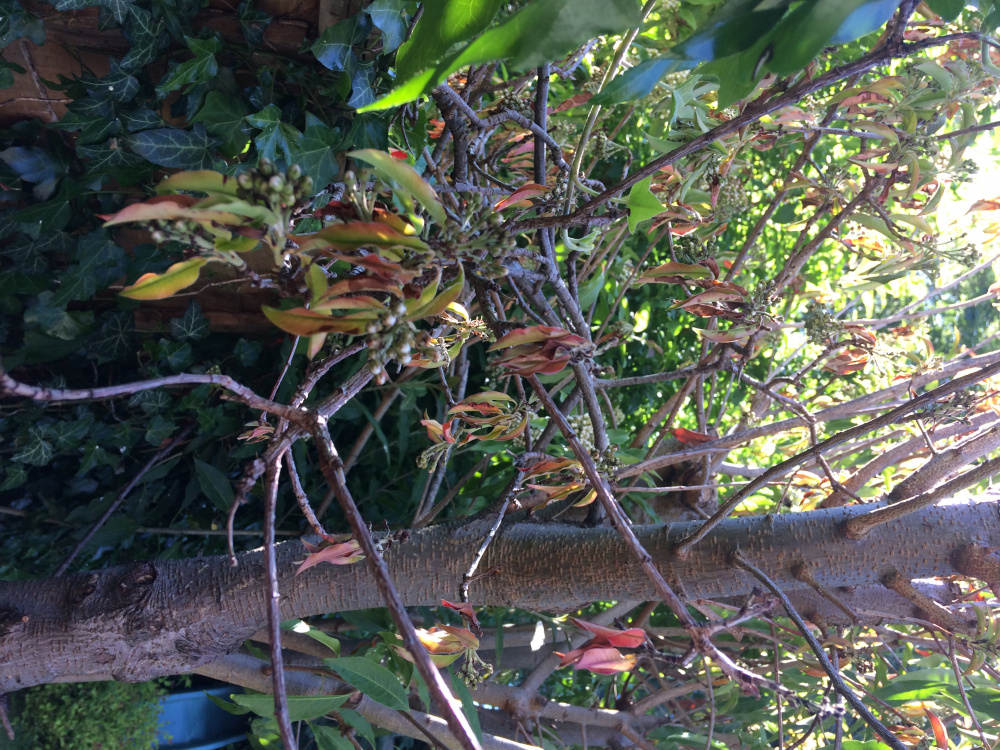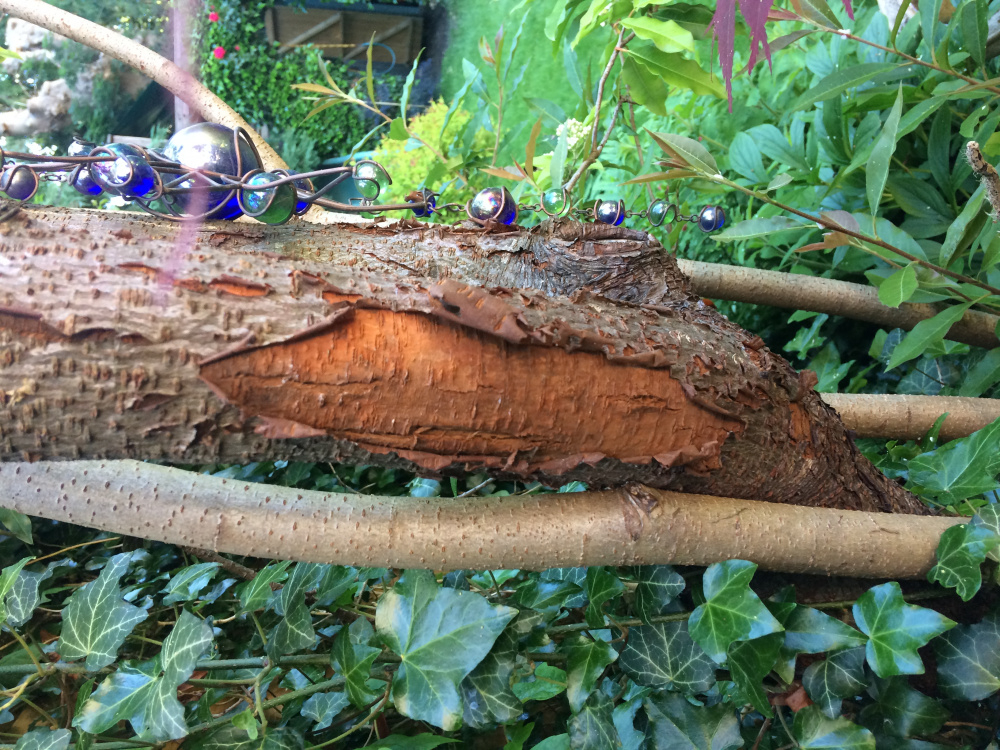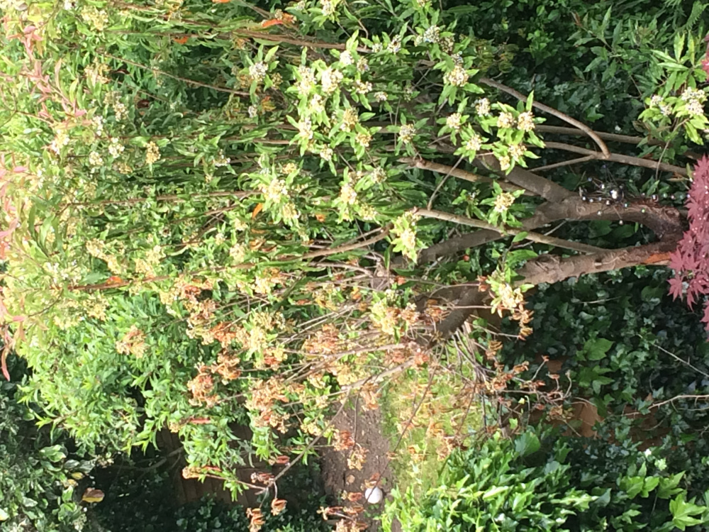 We have an old Photinia bush which we trim each year and it has always thrived and flowered. This year it is a tree of two halves. Tthe leaves and flowers on the old branches are brown and unhealthy and some of its bark is peeling. Last year we let some of its new branches grow from the bottom and they are thriving and flowering. Could this have affected the older parts of the shrub? Should we cut back the old trunk and branches to leave the newer branches or remove the newer ones to let the old parts recover? Or is something else going on?