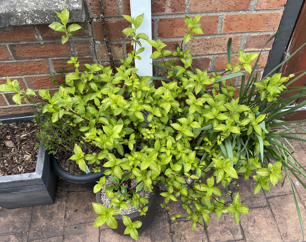 Hi there, I have 3 of these plants in pots on my patio. Two of them look very sick. The leaves are almost white and are very small. Is this a virus? Or perhaps a nutrient deficiency? Or too much sun? The third is only slightly better. I bought them last year and they have been in these pots for a exactly a year. Many thanks