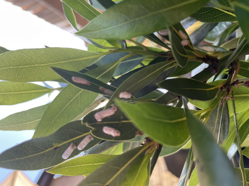 We have a bay tree in a large container where it has lived for some years. It has put on spectacular growth this year with a huge number of new leaves and looks really healthy. When I cut it back a little yesterday I noticed what I think are eggs/cocoons on the underside of a lot of the new leaves which remain healthy looking. I am having trouble identifying what the insect may be. Could anyone help please?