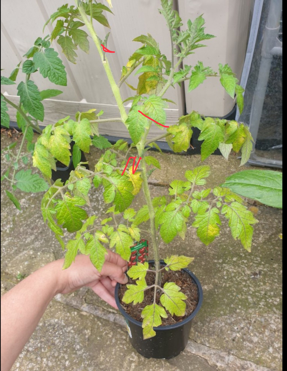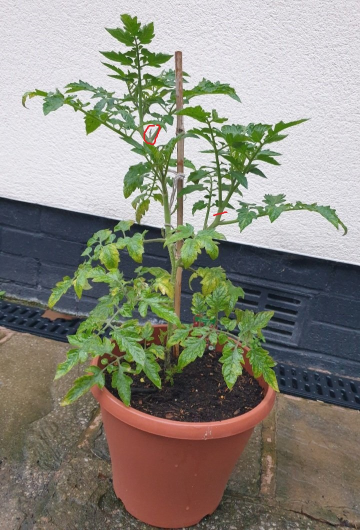 Remove any obvious new, small side shoots that are appearing - I've circled one near the top - but the other one I've put a line through also looks like a side shoot. It's just that they're getting quite large. It's a bit difficult to see well though.